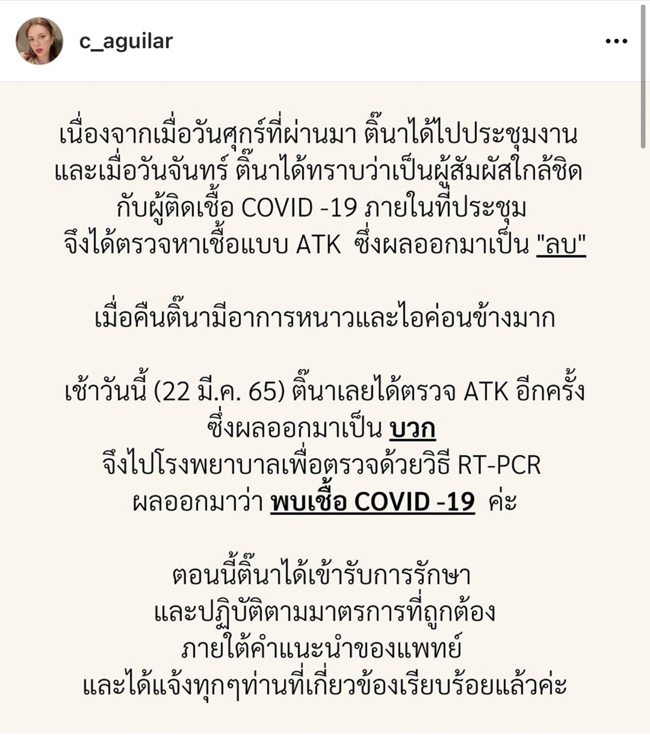 ยอดผู้ติดเชื้อโควิด-19 ในประเทศไทยยังคงพุ่งสูงอย่างต่อเนื่อง และสำหรับวงการบันเทิงก็ยังมีผู้ติดเชื้ออย่างต่อเนื่องเช่นกัน โดยคนบันเทิงรายล่าสุดที่แจ้งว่าติดโควิดก็คือ ติ๊นา คริสติน่า อากีล่าร์ โดยมีรายละเอียดดังนี้