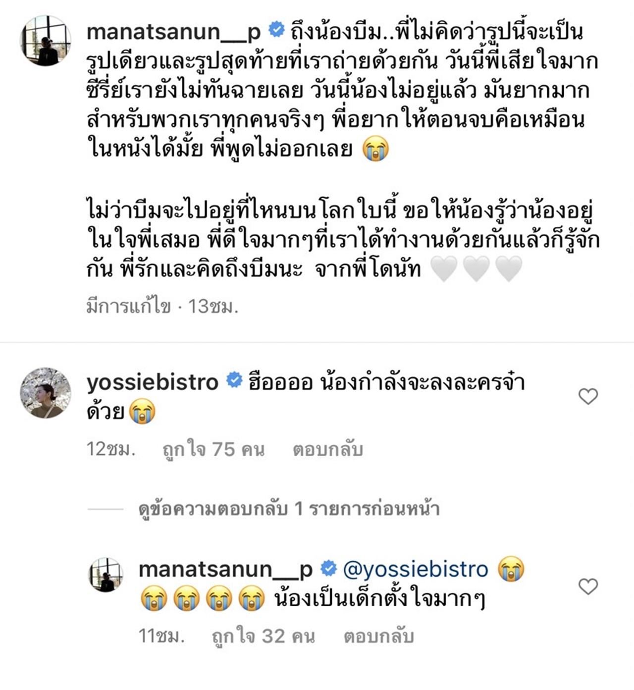 วันนี้พี่เสียใจมาก ซีรี่ย์เรายังไม่ทันฉายเลย วันนี้น้องไม่อยู่แล้ว มันยากมากสำหรับพวกเราทุกคนจริงๆ พี่อยากให้ตอนจบคือเหมือนในหนังได้มั้ย พี่พูดไม่ออกเลย