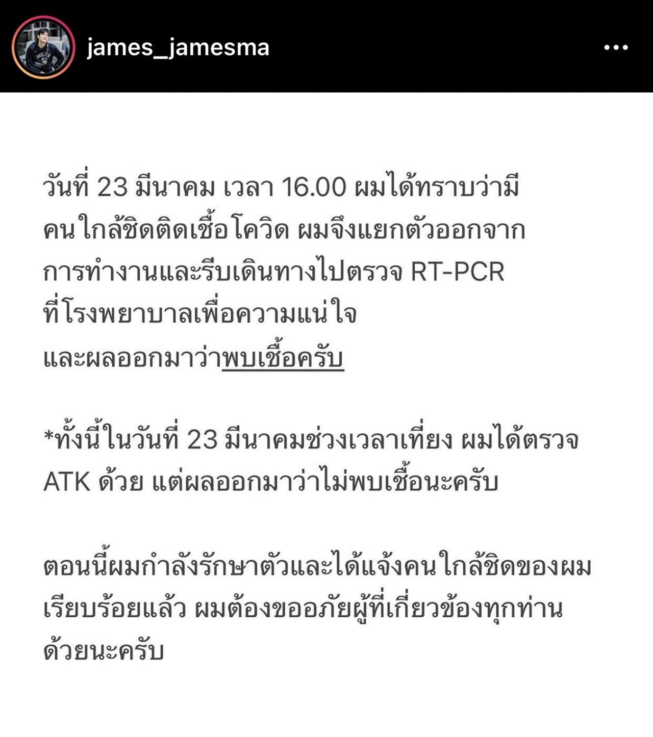 ทั้งนี้ในวันที่ 23 มีนาคมช่วงเวลาเที่ยง ผมได้ตรวจ ATK ด้วย แต่ผลออกมาว่าไม่พบเชื้อนะครับ ตอนนี้ผมกำลังรักษาตัวและได้แจ้งคนใกล้ชิดของผมเรียบร้อยแล้ว ผมต้องขออภัยผู้ที่เกี่ยวข้องทุกท่านด้วยนะครับ"