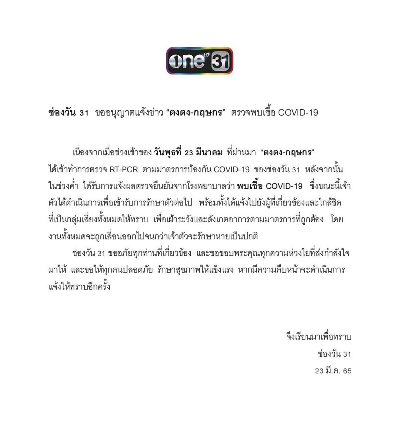 ในส่วนของ ตงตง กฤษกร ก็ได้แจ้งว่า "ช่องวัน 31 ขออนุญาตแจ้งข่าว ตงตง กฤษกร ตรวจพบเชื้อ COVID-19 เนื่องจากเมื่อช่วงเช้าของ วันพุธที่ 23 มีนาคม ที่ผ่านมา ตงตง กฤษกร ได้เข้าทำการตรวจ RT-PCR ตามมาตรการป้องกัน COVID-19 ของช่องวัน 31