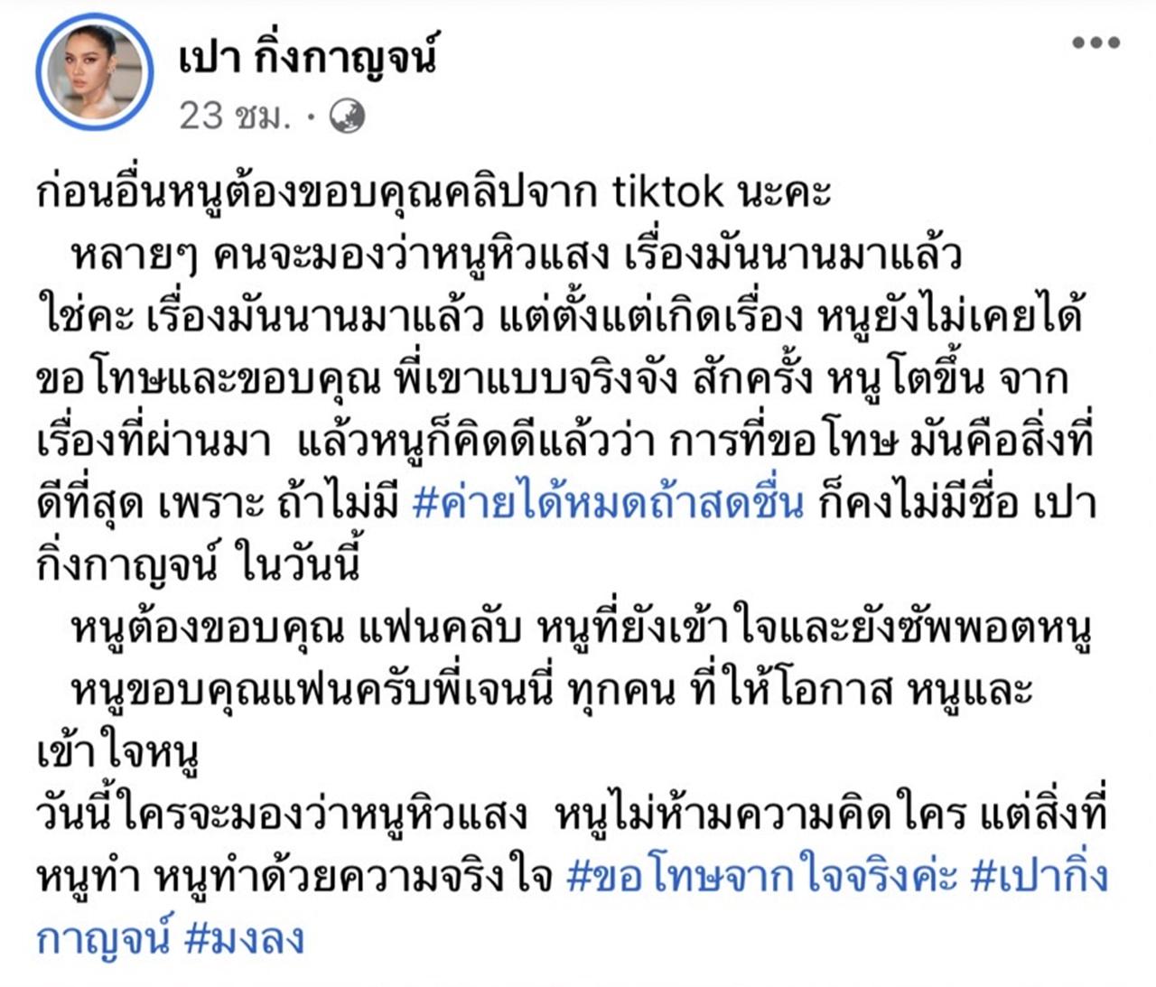 หนูขอบคุณแฟนคลับ พี่เจนนี่ ทุกคนที่ให้โอกาสหนูและเข้าใจหนู วันนี้ใครจะมองว่าหนูหิวแสง หนูไม่ห้ามความคิดใคร แต่สิ่งที่หนูทำ หนูทำด้วยความจริงใจ #ขอโทษจากใจจริงค่ะ #เปากิ่งกาญจน์ #มงลง”.