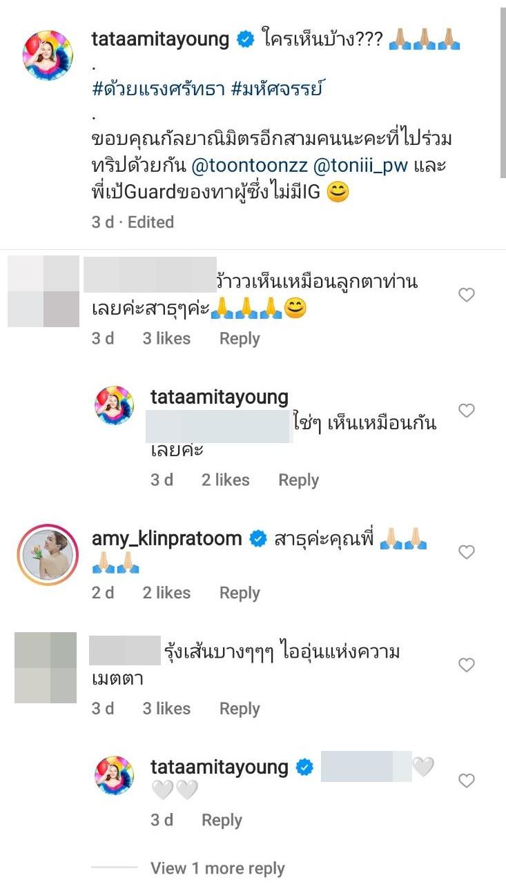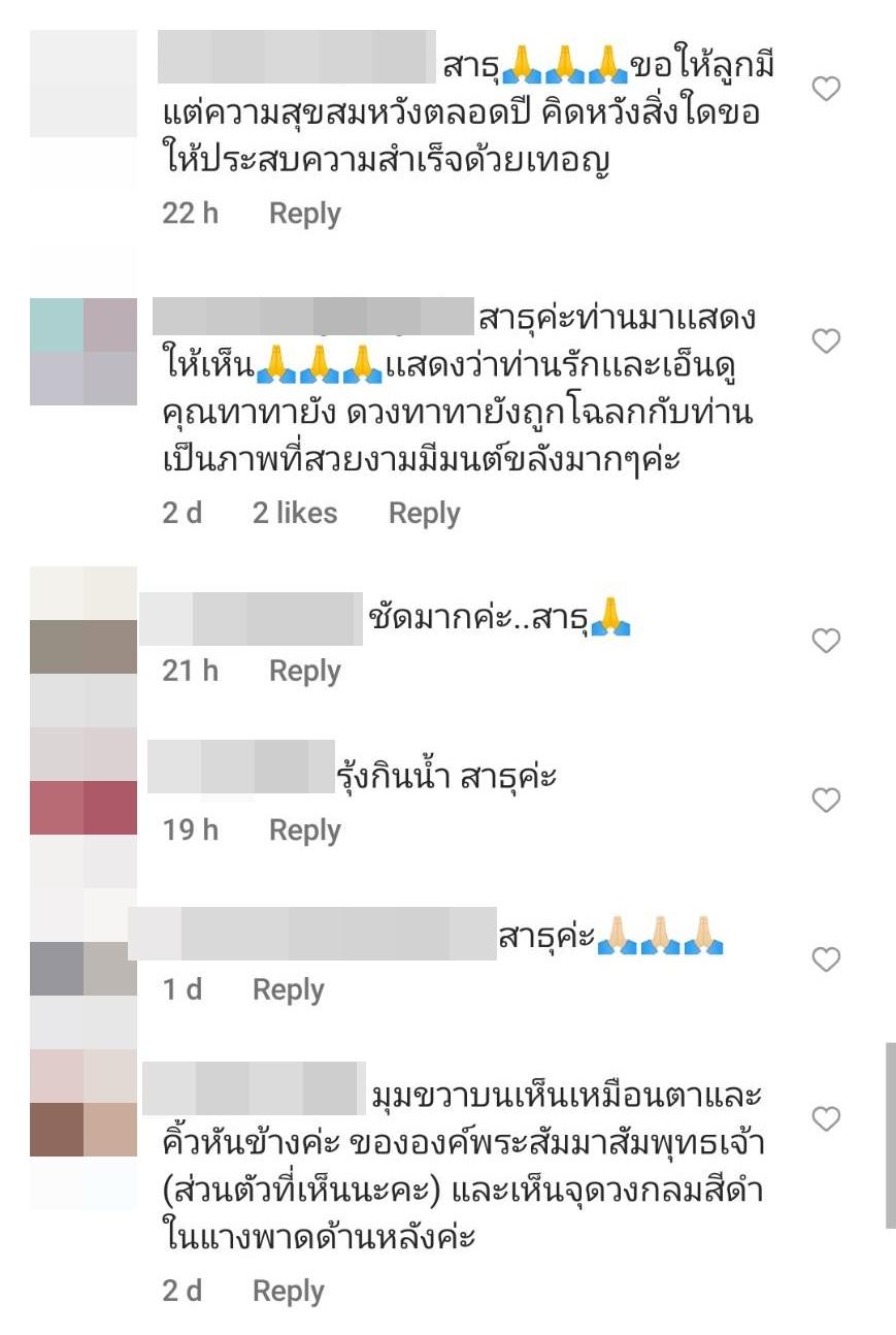 ด้าน เอมี่ กลิ่นประทุม ก็เข้ามาคอมเมนต์ว่า “สาธุค่ะคุณพี่” รวมไปถึงแฟนๆ ที่เข้ามาคอมเมนต์ว่า “รุ้งเส้นบางๆๆๆ ไออุ่นแห่งความเมตตา” และมีบางคนที่โฟกัสด้านหลังและบอกว่า “ว้าวว เห็นเหมือนลูกตาท่านเลยค่ะ สาธุๆ ค่ะ” ซึ่งทาทาก็ตอบกลับว่า “ใช่ๆ เห็นเหมือนกันเลยค่ะ”.