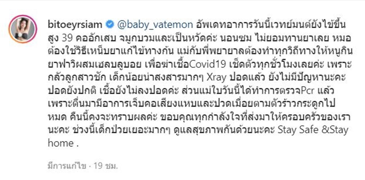 ล่าสุด ใบเตย อาร์สยาม ก็ได้อัปเดตอาการของลูกสาวให้ทุกคนที่เป็นห่วงทราบ พร้อมกับแจ้งข่าวว่าตัวเธอนั้นตรวจพบว่าติดโควิดตามลูกน้อยไปแล้วว่า