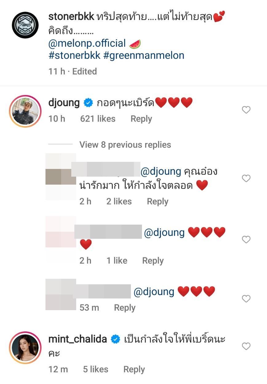 โดยมีแฟนๆ เข้ามาคอมเมนต์ให้กำลังใจเบิร์ดนับพันข้อความ ด้านดีเจดัง อ๋อง เขมรัชต์ ก็เข้ามาคอมเมนต์ให้กำลังใจว่า “กอดๆ นะเบิร์ด” และมีแฟนๆ กดไลค์พร้อมทั้งชื่นชมที่ดีเจอ๋องตามมาให้กำลังใจเบิร์ดตลอดด้วย.