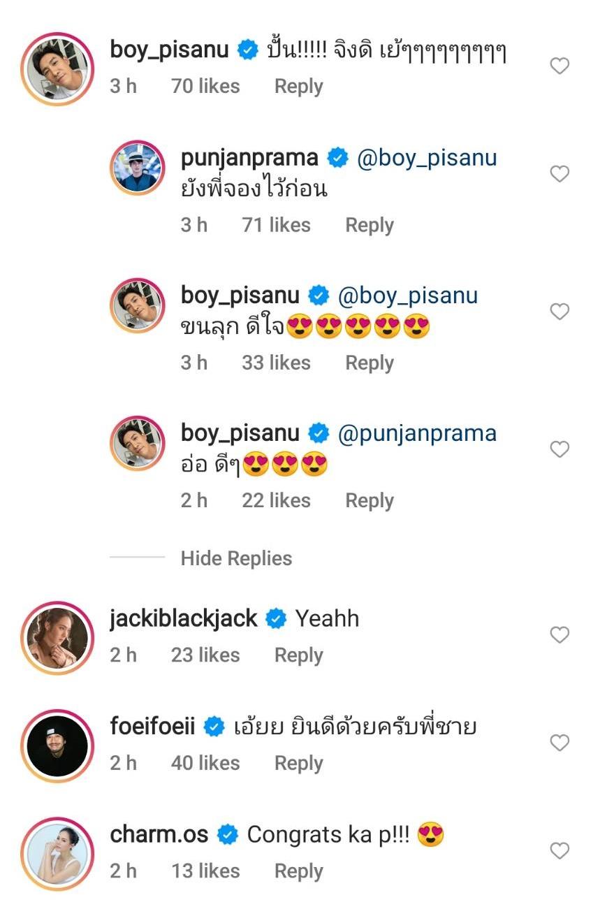 และล่าสุดก็ทำเอาโลกโซเชียลฮือฮา เมื่อปั้นจั่นโพสต์ภาพโชว์แหวนคู่กับแฟนสาว โดยมีเพื่อนๆ ตลอดจนแฟนๆ ร่วมแสดงความยินดี ด้านนักแสดงรุ่นพี่บอย พิษณุ นิ่มสกุล ถึงกับรีบคอมเมนต์ “ปั้น!!!!!! จริงดิ เย้ๆๆๆๆๆ” ก่อนที่ปั้นจั่นจะรีบตอบกลับว่า “ยังพี่ จองไว้ก่อน” ซึ่งบอยก็ตอบกลับอีกว่า “ขนลุก ดีใจ” และ “อ่อ ดีๆ”.