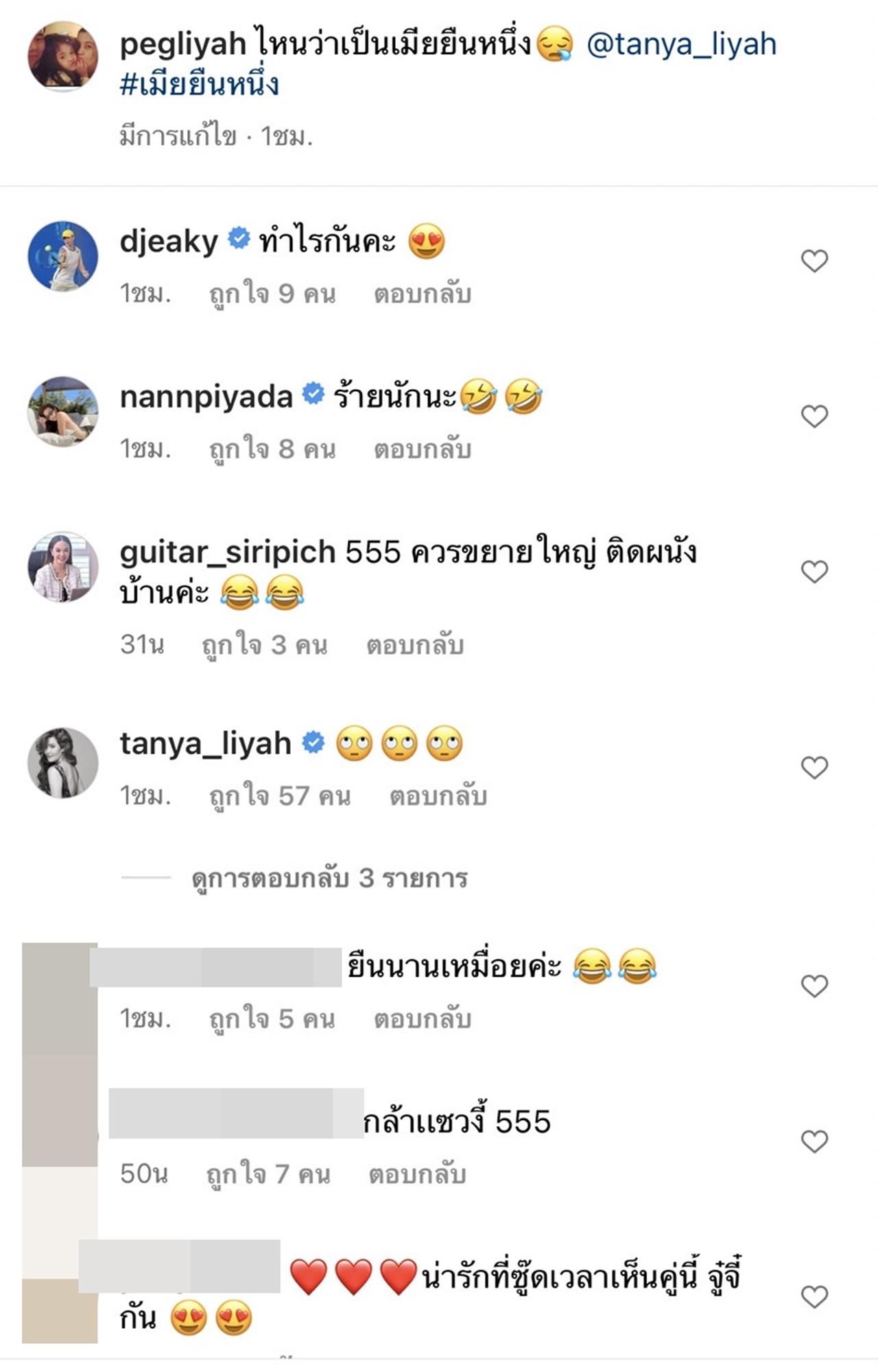 ส่วนทางด้านเมียรัก ธัญญ่า ธัญญาเรศ เมื่อรู้ตัวว่าถูกแกง ก็ได้เข้ามาคอมเมนต์อีโมจิเป็นรูปหน้ามองบน ซึ่งก็มีชาวเน็ตถูกใจเข้ามากดไลค์ในความน่ารักที่คู่นี้เขาหยอกกันออกสื่อมากมาย