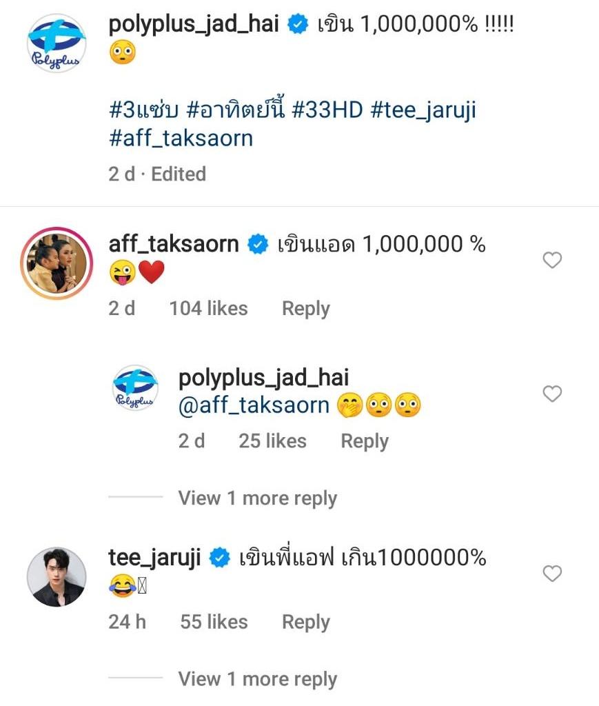 นอกจากนี้ ในไอจีค่ายโพลีพลัส @polyplus_jad_hai ก็โพสต์คลิปตอนที่แอฟเดินมา งานนี้ทำเอาตี๋เขินหนักจนต้องถอย ทำเอาทีมงานแซวว่าเขินเหรอ ซึ่งตี๋ก็พยักหน้ายอมรับ พอทีมงานบอกแอฟว่ามีคนเขิน แอฟก็เดินมาที่ตี๋พร้อมทั้งทักทายว่าไม่ได้เจอนานมาก สบายดีไหม