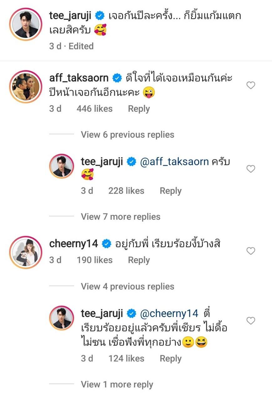 ด้านคนในภาพอย่างแอฟก็คอมเมนต์ว่า “ดีใจที่ได้เจอเหมือนกันค่ะ ปีหน้าเจอกันอีกนะคะ” ซึ่งตี๋ก็ตอบกลับว่า “ครับ” และใส่อีโมจิหน้าตาแฮปปี้หัวใจล้อมรอบ ทำเอาแฟนๆ แห่กดไลค์และแซวกระหน่ำเลยทีเดียว