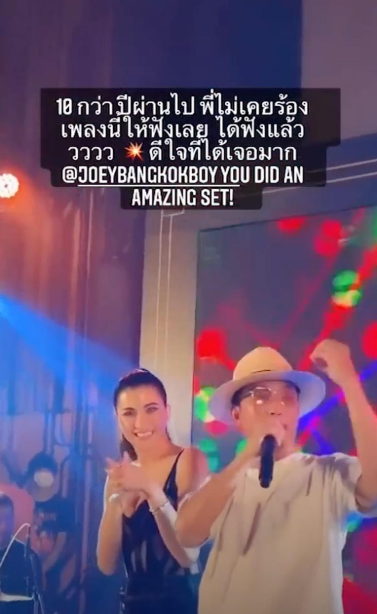 โจอี้ บอย โดนจ้างมาร้องเพลง “ร้ายก็รัก” โดยมี ปู ยืนเต้นสวยๆ อยู่ด้วยกัน หลังเต้นเสร็จน่าจะปลื้มอย่างแรง จนต้องออกมาโพสต์คลิปลงในไอจีสตอรี่ พร้อมแท็กไปถึงไอจีโจอี้ ดังนี้ “10 กว่าปีผ่านไป พี่ไม่เคยร้องเพลงนี้ให้ฟังเลย ได้ฟังแล้ววววว ดีใจที่ได้เจอมาก @joeybangkokboy You did an amazing set !”