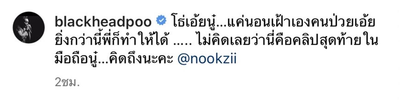 และปูก็ได้โพสต์คลิปดังกล่าวพร้อมเขียนแคปชั่นว่า "โธ่เอ้ยนู๋…แค่นอนเฝ้าเองคนป่วยเอ๊ย ยิ่งกว่านี้พี่ก็ทำให้ได้ ….. ไม่คิดเลยว่านี่คือคลิปสุดท้ายในมือถือนู๋…คิดถึงนะคะ @nookzii"