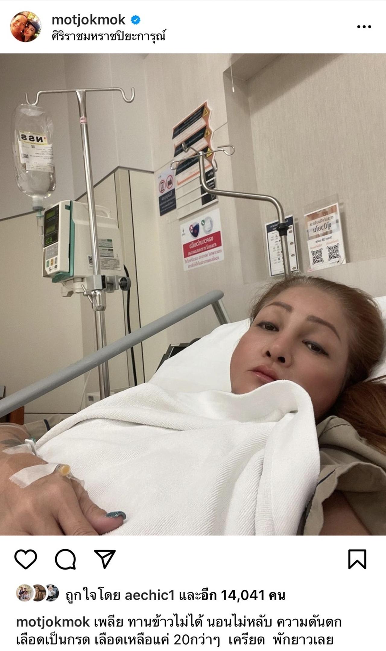โดย มด เอ็นดู ได้เผยภาพตัวเองขณะกำลังนอนอยู่บนเตียงผู้ป่วย พร้อมเขียนแคปชั่นว่า "เพลีย ทานข้าวไม่ได้ นอนไม่หลับ ความดันตก เลือดเป็นกรด เลือดเหลือแค่ 20กว่าๆ เครียด พักยาวเลย"