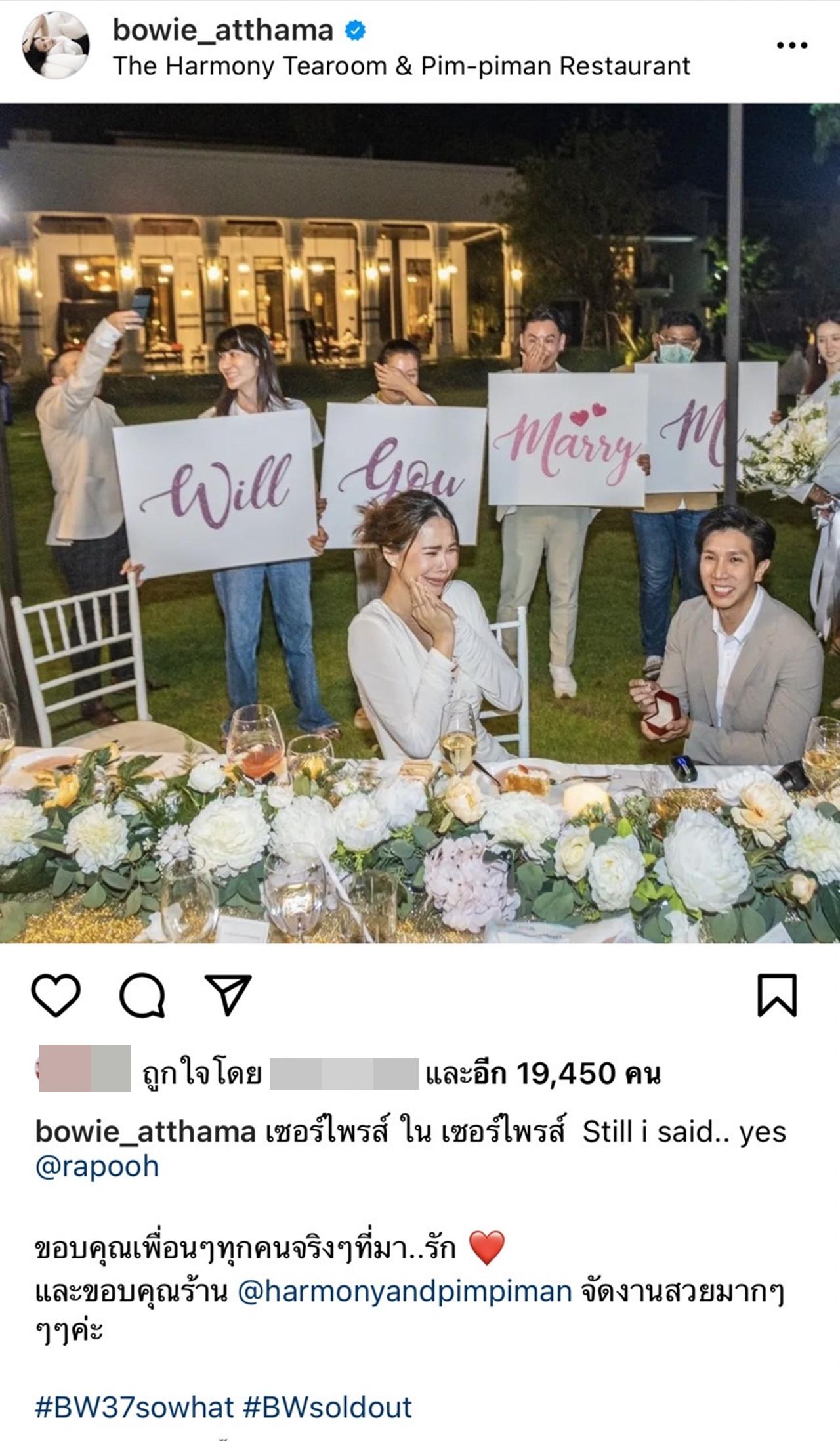 ล่าสุด โบวี่ ก็ได้โพสต์ข้อความผ่านอินสตาแกรมว่า "เซอร์ไพรส์ ใน เซอร์ไพรส์ Still i said.. yes @rapooh ขอบคุณเพื่อนๆทุกคนจริงๆที่มา..รัก และขอบคุณร้าน @harmonyandpimpiman จัดงานสวยมากๆๆๆค่ะ #BW37sowhat #BWsoldout"