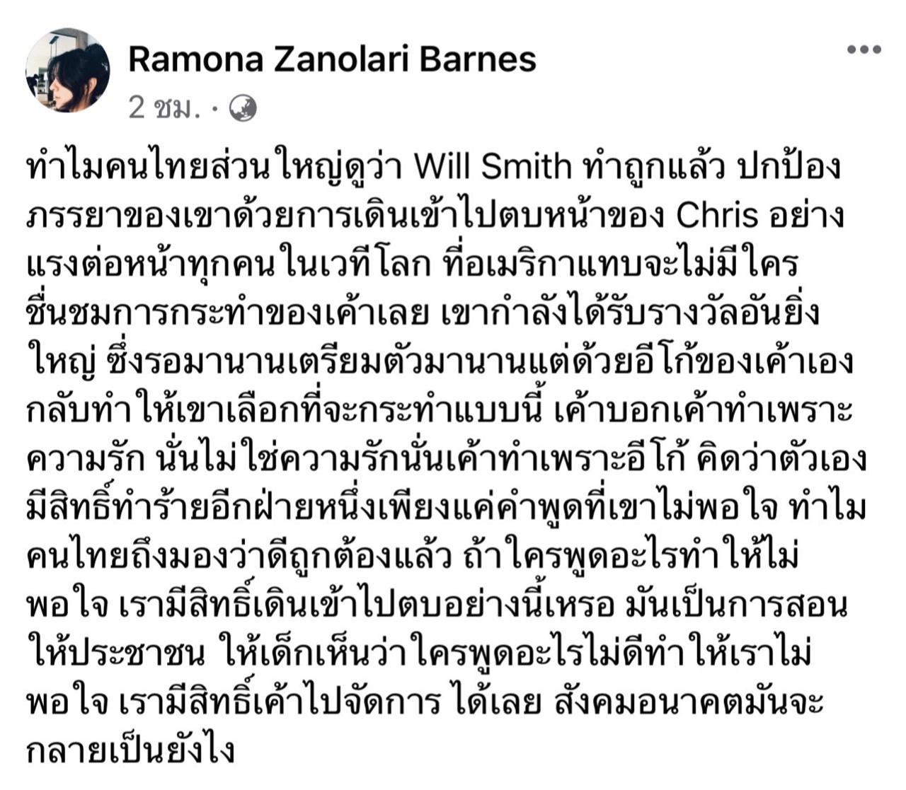 “ทำไมคนไทยส่วนใหญ่ดูว่า Will Smith ทำถูกแล้ว ปกป้องภรรยาของเขาด้วยการเดินเข้าไปตบหน้าของ Chris อย่างแรงต่อหน้าทุกคนในเวทีโลก