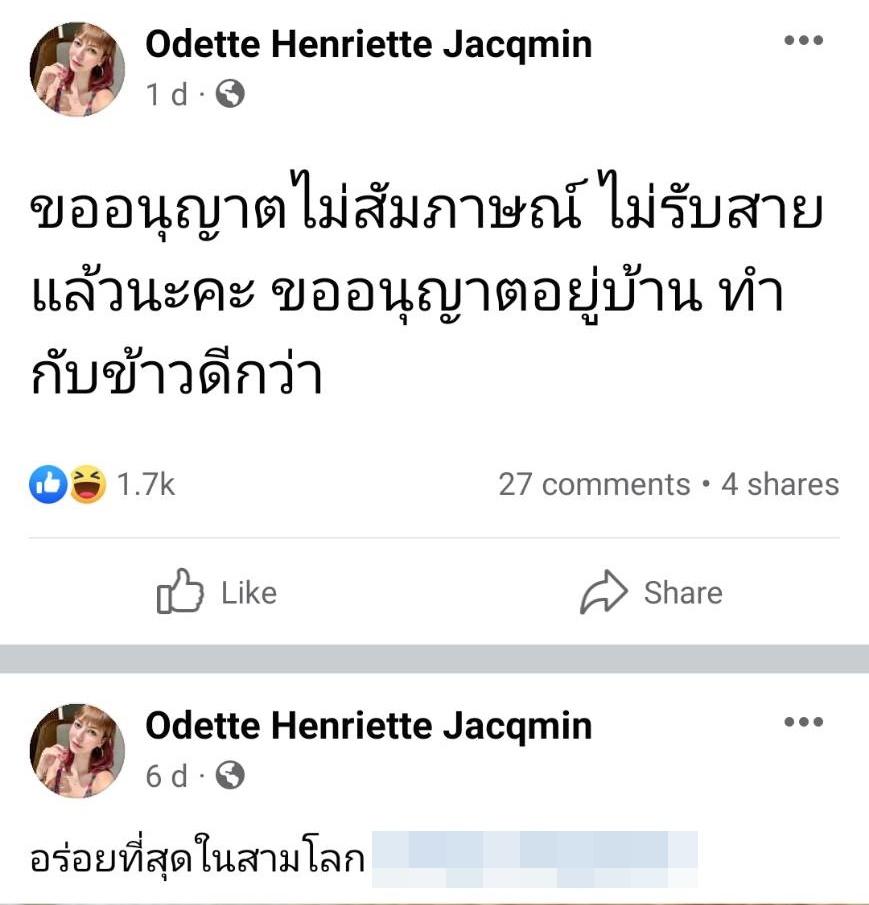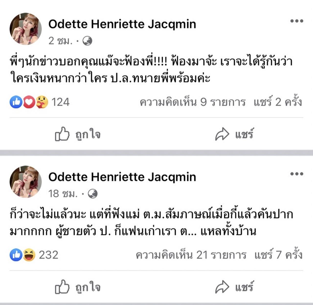 หลังจากอดีตนางแบบสาว โอเด็ต เฮนเรียต แจ็คโคมิน ได้โพสต์ข้อความเกี่ยวกับเรื่องนักแสดงสาว แตงโม นิดา พัชรวีระพงษ์ จนเป็นที่ฮือฮา ทั้งข้อความ “ก็ว่าจะไม่แล้วนะ แต่ที่ฟังแม่ ต.ม. สัมภาษณ์เมื่อกี้แล้วคันปากมากกกก ผู้ชายตัว ป. ก็แฟนเก่าเรา ต… แหลทั้งบ้าน” รวมถึง “พี่ๆ นักข่าวบอกคุณแม๊จะฟ้องพี่!!!! ฟ้องมาจ้ะ เราจะได้รู้กันว่าใครเงินหนากว่าใคร ป.ล.ทนายพี่พร้อมค่ะ”