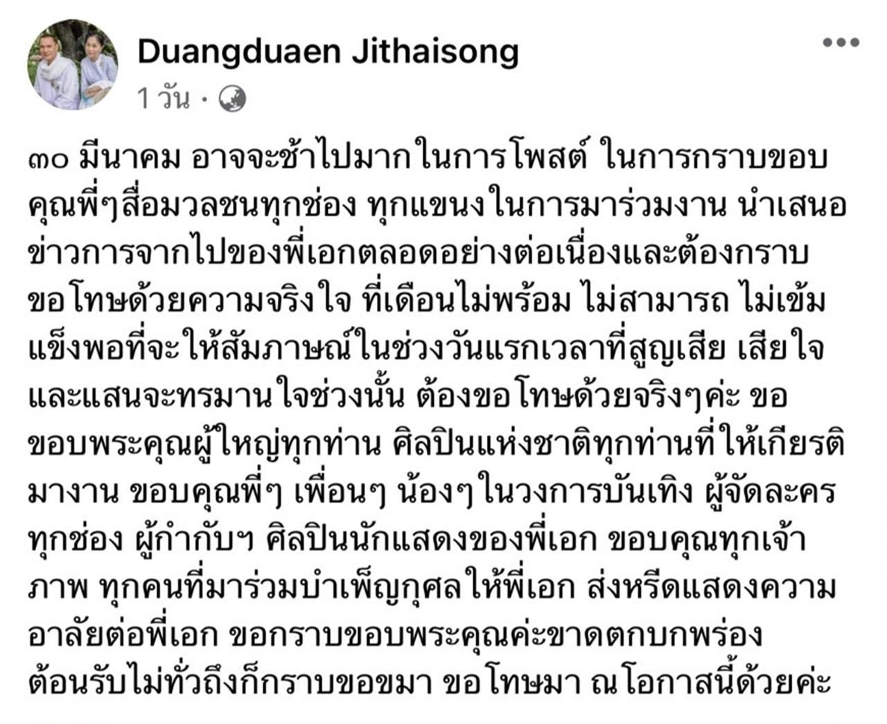 "30 มีนาคม อาจจะช้าไปมากในการโพสต์ ในการกราบขอบคุณพี่ๆสื่อมวลชนทุกช่อง ทุกแขนงในการมาร่วมงาน นำเสนอข่าวการจากไปของพี่เอกตลอดอย่างต่อเนื่องและต้องกราบขอโทษด้วยความจริงใจ ที่เดือนไม่พร้อม ไม่สามารถ ไม่เข้มแข็งพอที่จะให้สัมภาษณ์ในช่วงวันแรกเวลาที่สูญเสีย เสียใจและแสนจะทรมานใจช่วงนั้น ต้องขอโทษด้วยจริงๆ ค่ะ