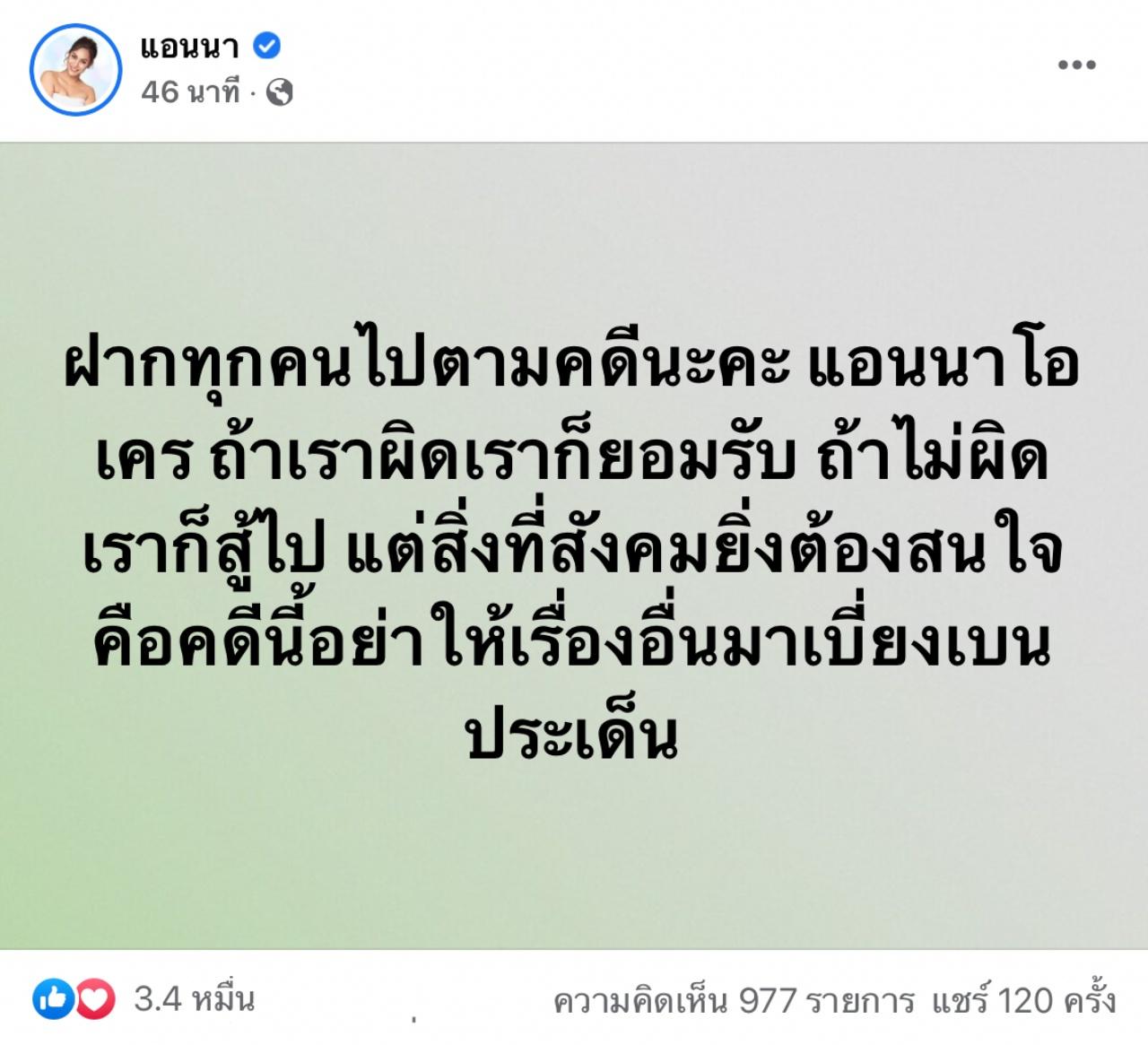 - ฝากทุกคนให้ติดตามคดีนะคะ แอนนาโอเค ถ้าเราผิดเราก็ยอมรับ ถ้าไม่ผิดเราก็สู้ไป แต่สิ่งที่สังคมยิ่งต้องสนใจคือคดีนี้ อย่าให้เรื่องอื่นมาเบี่ยงเบนประเด็น