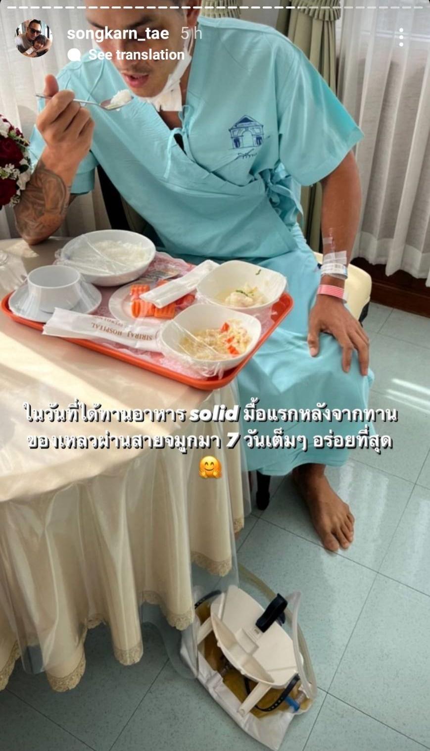 ล่าสุด สงกรานต์โพสต์ภาพตัวเองขณะนั่งทานอาหารอยู่ใน รพ. พร้อมทั้งเขียนแคปชั่นในรูปไว้ว่า “ในวันที่ได้ทานอาหาร solid มื้อแรกหลังจากทานของเหลวผ่านสายจมูกมา 7 วันเต็มๆ อร่อยที่สุด” หลังจากนั้นโพสต์ภาพตัวเอง ซึ่งจากในภาพมีเลือดออกในตา หน้าตายังบวมปูดอยู่มาก อีกทั้งยังโพสต์ภาพอาหารจำนวนมาก รวมถึงกำลังใจจากเพื่อนๆ ที่ส่งเข้ามาด้วย.