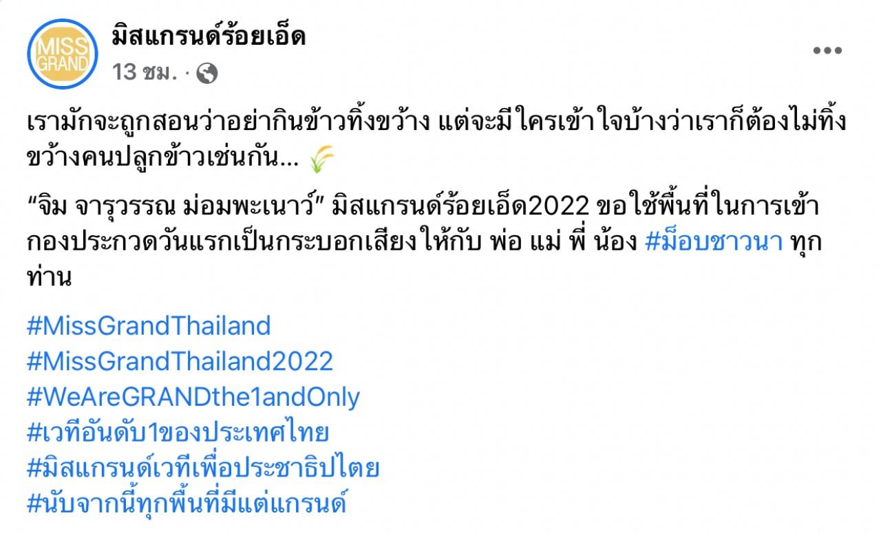 เพจหลักของ มิสแกรนด์ร้อยเอ็ด 2022 ได้โพสต์ไว้ว่า เรามักจะถูกสอนว่าอย่ากินข้าวทิ้งขว้าง แต่จะมีใครเข้าใจบ้าง ว่าเราก็ต้องไม่ทิ้งขว้างคนปลูกข้าวเช่นกัน