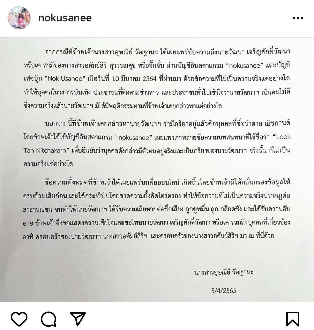 นอกจากนี้ที่ข้าพเจ้าเคยกล่าวหานายวัฒนาฯ ว่ามีภริยาอยู่แล้ว คือบุคคลที่ชื่อว่า ตาล ณิชกานต์ โดยข้าพเจ้าใช้บัญชีอินสตาแกรม “nokusanee” เผยแพร่ภาพถ่ายข้อความบทสนทนาที่ใช้ชื่อว่า “Look Tan Nitchakarn” เพื่อยืนยันว่าบุคคลดังกล่าวมีตัวตนอยู่จริงแล้วเป็นภรรยาของนายวัฒนาฯ จริงนั้น ก็ไม่เป็นความจริงแต่อย่างใด