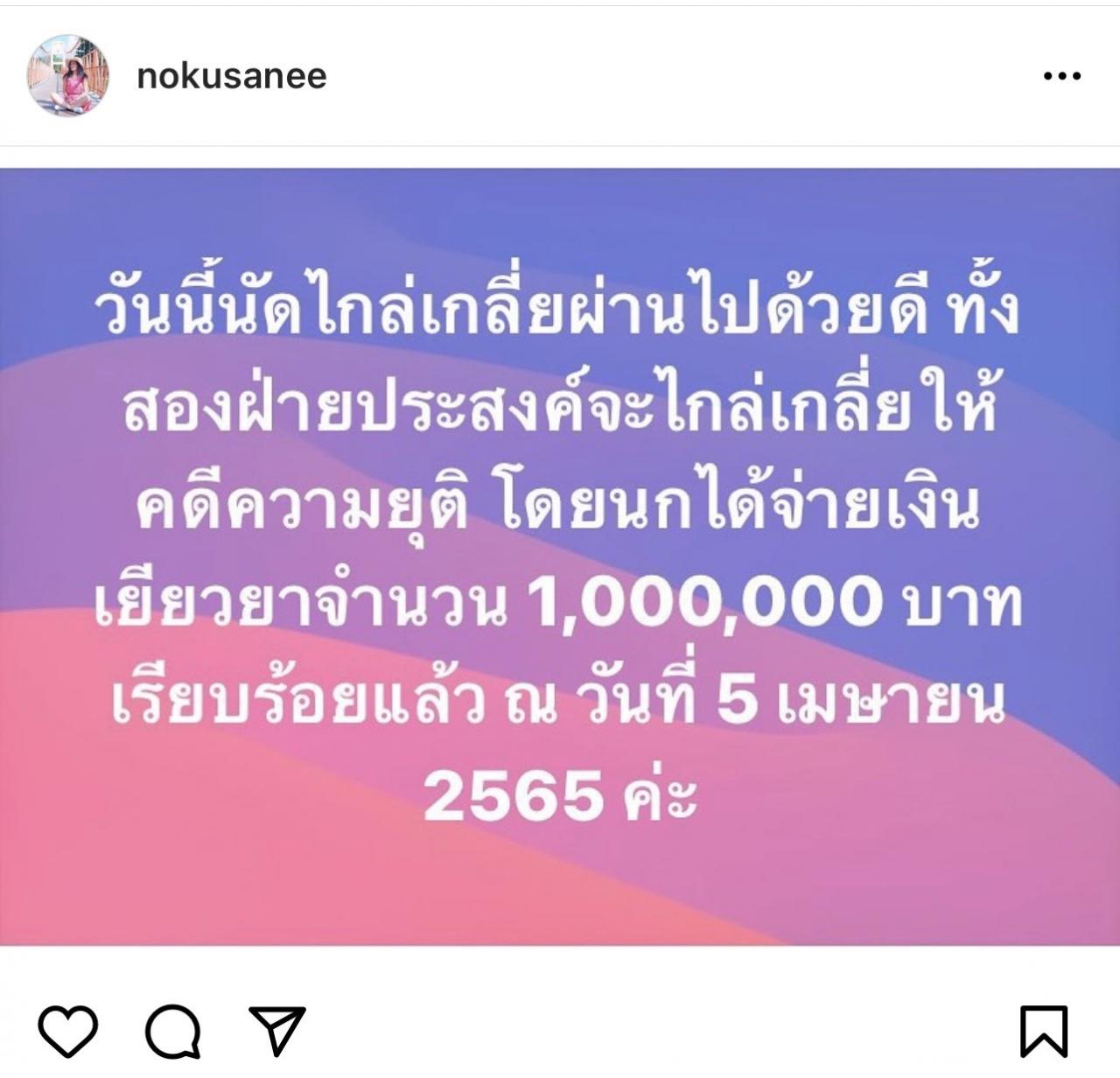 นอกจากนี้ นก อุษณีย์ ยังได้แจ้งว่าจ่ายเงินเยียวยาให้ เค วัฒนา เป็นจำนวนเงิน 1 ล้านบาท โดยโพสต์ภาพข้อความที่เขียนว่า “วันนี้นัดไกล่เกลี่ยผ่านไปด้วยดี ทั้งสองฝ่ายประสงค์จะไกล่เกลี่ยให้คดีความยุติ โดยนกได้จ่ายเงินเยียวยา จำนวน 1,000,000 บาท เรียบร้อยแล้ว ณ วันที่ 5 เมษายน 2565 ค่ะ”.