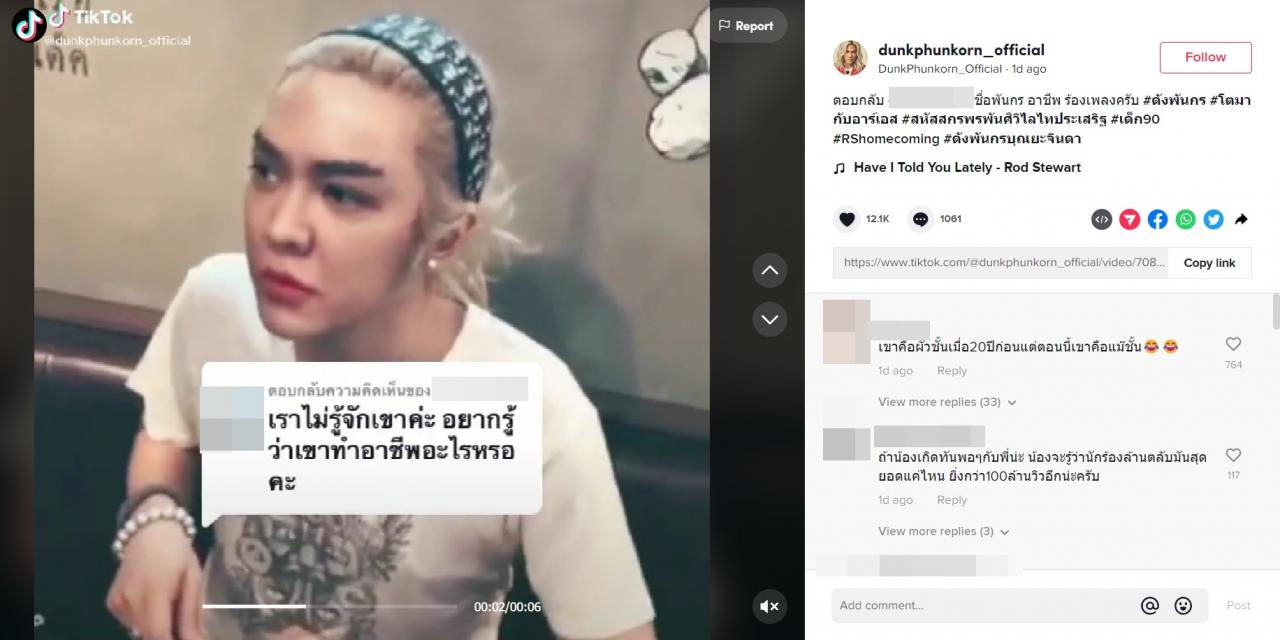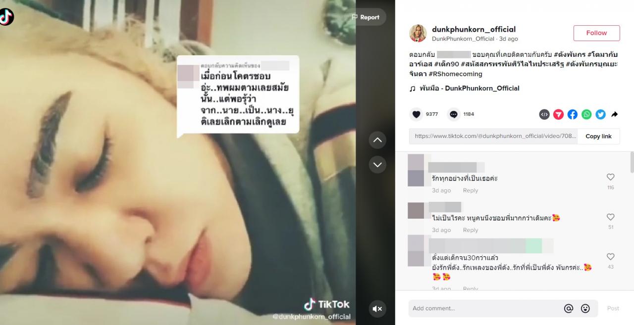 ล่าสุด ดัง พันกร โพสต์คลิป TikTok ตอบคำถามหลังมีคนคอมเมนต์แรงว่า “เมื่อก่อนโคตรชอบอ่ะ... ทำผมตามเลยสมัยนั้น... แต่พอรู้ว่าจาก... นาย... เป็น... นาง...ยุติเลย เลิกตามเลิกดูเลย” ซึ่งดังก็ตอบกลับแบบนิ่มๆ สั้นๆ ว่า “ขอบคุณที่เคยติดตามกันครับ”