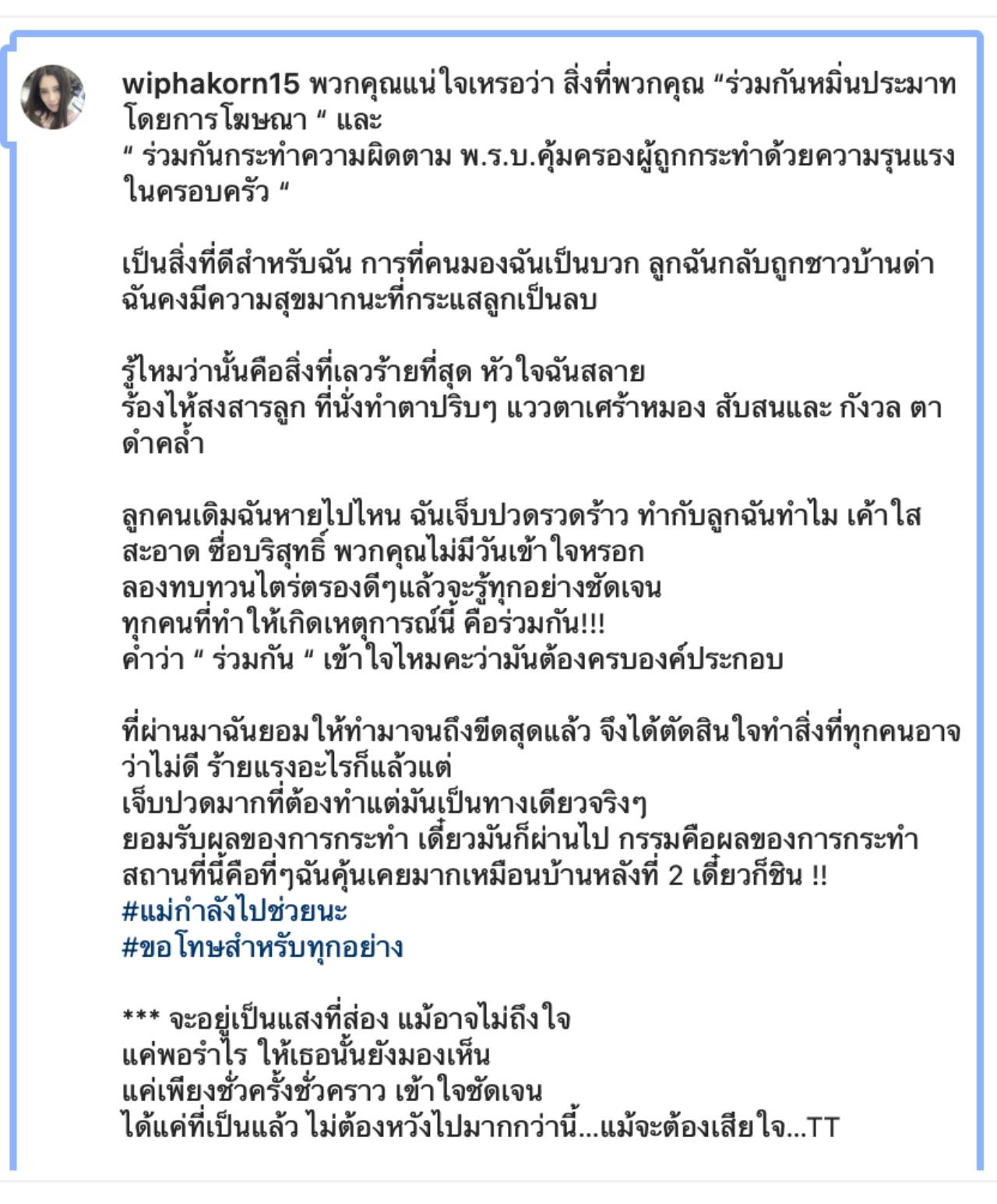 พวกคุณแน่ใจเหรอว่า สิ่งที่พวกคุณ “ร่วมกันหมิ่นประมาทโดยการโฆษณา“ และ “ร่วมกันกระทำความผิดตาม พ.ร.บ.คุ้มครองผู้ถูกกระทำ ด้วยความรุนแรงในครอบครัว“ เป็นสิ่งที่ดีสำหรับฉัน การที่คนมองฉันเป็นบวก ลูกฉันกลับถูกชาวบ้านด่า ฉันคงมีความสุขมากนะ ที่กระแสลูกเป็นลบ