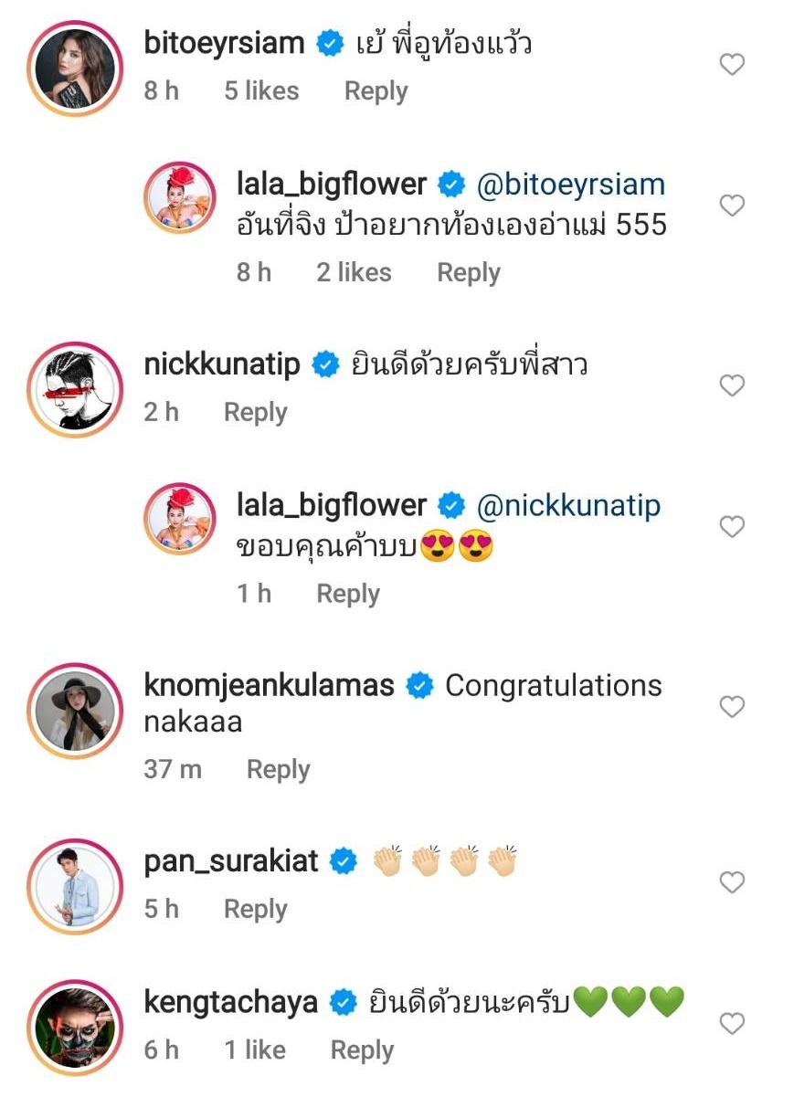 โดยมีแฟนๆ ร่วมแสดงความยินดี รวมไปถึงคนในวงการบันเทิงอีกหลายคนที่แสดงความยินดีเช่นกัน ด้าน ใบเตย อาร์สยาม ก็ได้คอมเมนต์ว่า “เย้ พี่อูท้องแว้ว” และลาล่าตอบกลับว่า “อันที่จริง ป้าอยากท้องเองอ่าแม่ 555”.