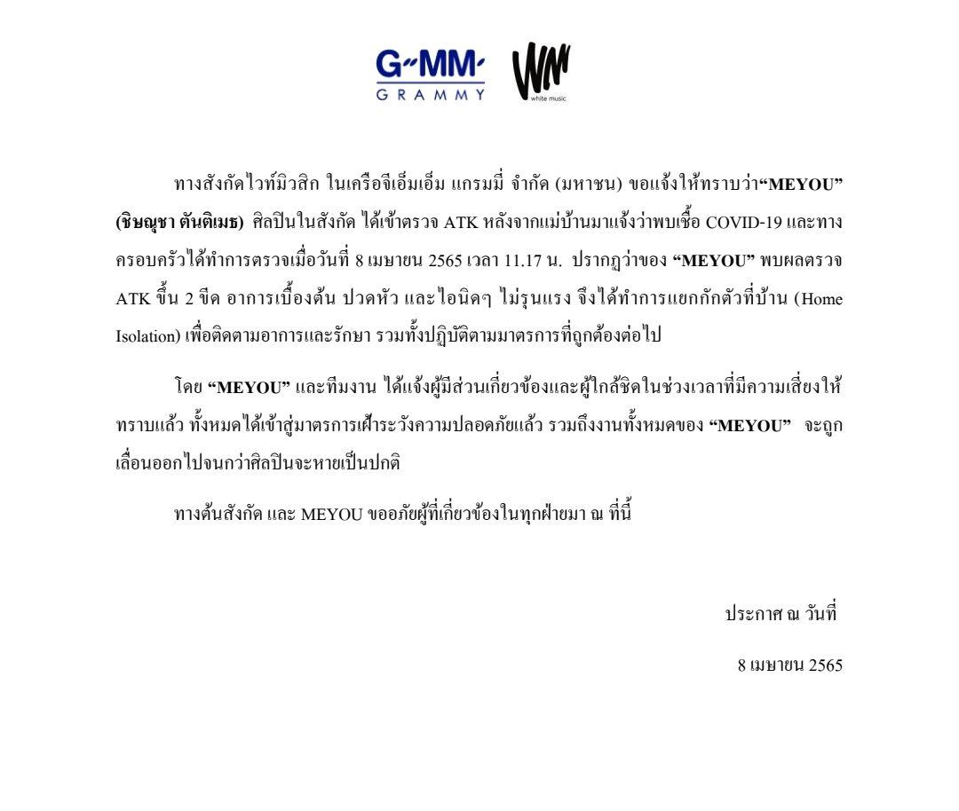 โดย “MEYOU” และทีมงาน ได้แจ้งผู้มีส่วนเกี่ยวข้องและผู้ใกล้ชิดในช่วงเวลาที่มีความเสี่ยงให้ทราบแล้ว ทั้งหมดได้เข้าสู่มาตรการเฝ้าระวังความปลอดภัยแล้ว รวมถึงงานทั้งหมดของ “MEYOU” จะถูกเลื่อนออกไปจนกว่าศิลปินจะหายเป็นปกติ ทางต้นสังกัดและ MEYOU ขออภัยผู้ที่เกี่ยวข้องในทุกฝ่ายมา ณ ที่นี้ ประกาศ ณ วันที่ 8 เมษายน 2565”.