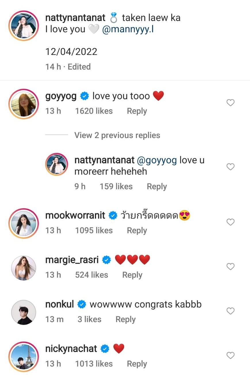 โดย นัตตี้ นันทนัท ได้โพสต์ภาพคู่กับแมน และสังเกตเห็นว่านิ้วนางข้างซ้ายสวมแหวนเพชร พร้อมทั้งเขียนข้อความสั้นๆ ว่า “taken laew ka I love you @mannyyy.l 12/04/2022” ด้าน แมน ณัฐภูมิ ก็โพสต์ภาพเดียวกัน พร้อมทั้งเขียนแคปชั่นว่า “The only "yes" I’ve been after all my life. 12.04.2022 @nattynantanat”