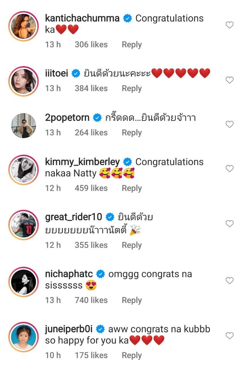 ท่ามกลางคอมเมนต์จากแฟนๆ ที่ร่วมแสดงความยินดีหลายพันข้อความ รวมถึงเพื่อนดาราที่ร่วมแสดงความยินดีอีกเพียบ อาทิ ก้อย อรัชพร, นิกกี้ ณฉัตร, ใหม่ ดาวิกา, มุก วรนิษฐ์, มาร์กี้ ราศรี, คิมเบอร์ลี่, ใบเตย สุวพิชญ์, ตู่ ภพธร, ติช่า กันติชา ฯลฯ บันเทิงไทยรัฐออนไลน์ขอแสดงความยินดีด้วยนะคะ.