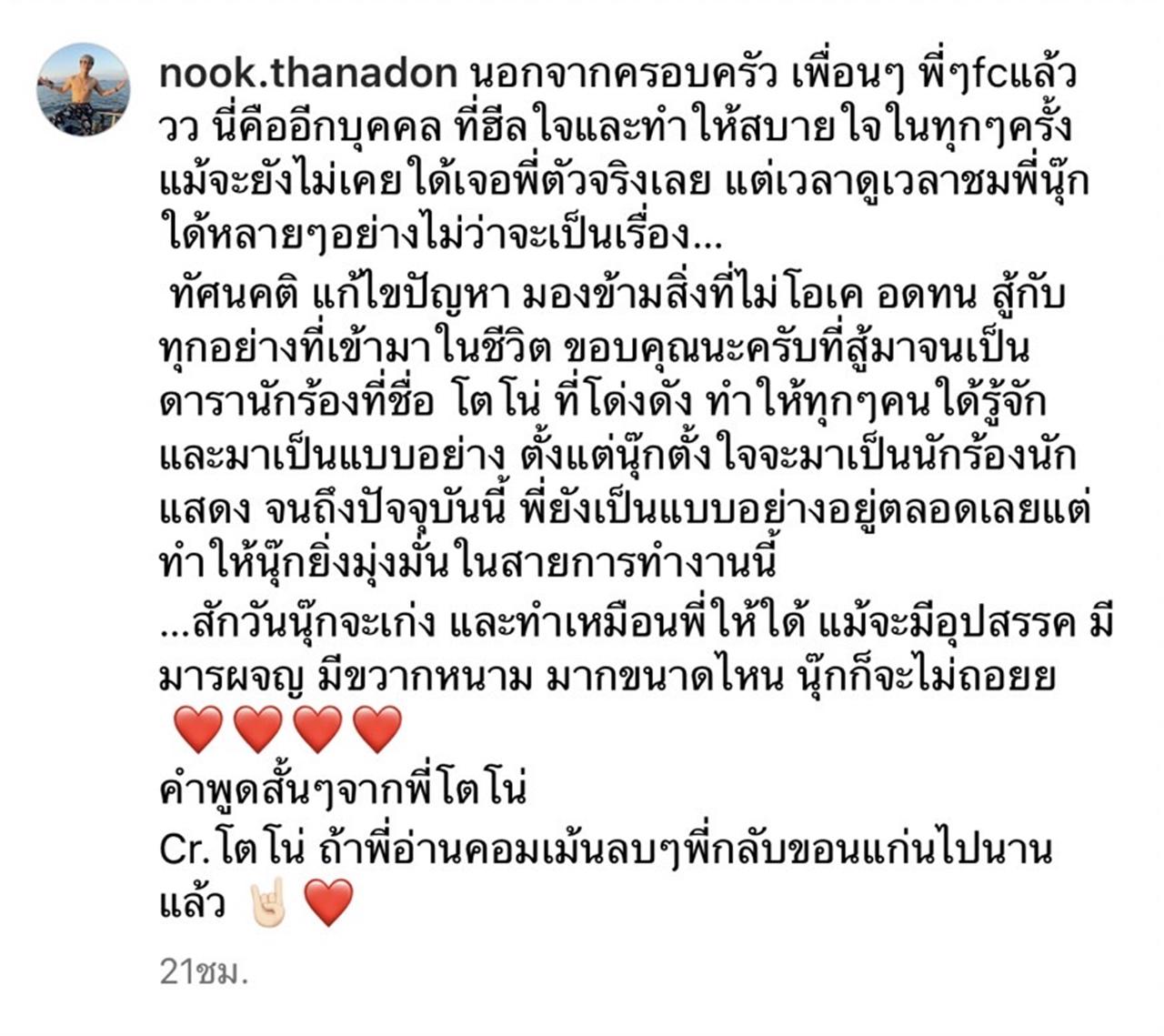 "นอกจากครอบครัว เพื่อนๆ พี่ๆfcแล้ววว นี่คืออีกบุคคล ที่ฮีลใจและทำให้สบายใจในทุกๆครั้ง แม้จะยังไม่เคยใด้เจอพี่ตัวจริงเลย แต่เวลาดูเวลาชมพี่นุ๊กใด้หลายๆอย่างไม่ว่าจะเป็นเรื่องทัศนคติ แก้ไขปัญหา มองข้ามสิ่งที่ไม่โอเค อดทน สู้กับทุกอย่างที่เข้ามาในชีวิต