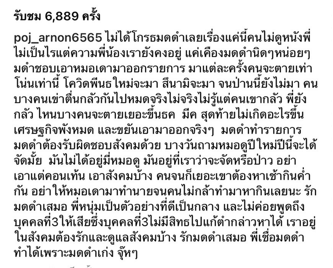 "ไม่ได้โกรธมดดำเลยเรื่องแค่นี้ คนไม่ดูหนังพี่ไม่เป็นไร แต่ความเป็นพี่น้องเรายังคงอยู่ แค่เคืองมดดำนิดๆ หน่อยๆ มดดำชอบเอาหมอเดามาออกรายการ มาแต่ละครั้งคนจะตายเท่าโน้นเท่านี้ โควิดพันธุ์ใหม่จะมา สึนามิจะมา จนป่านนี้ยังไม่มา