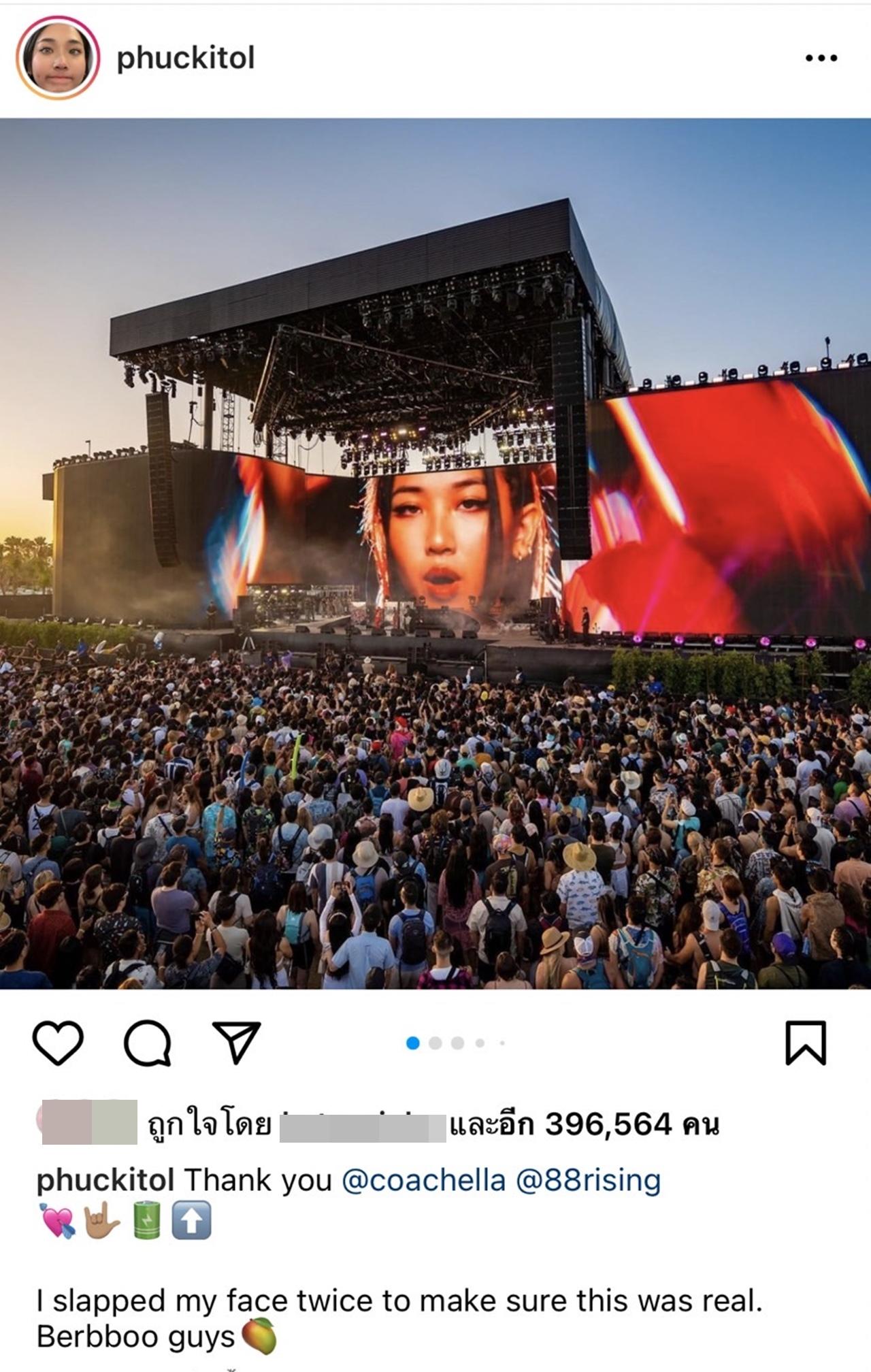 "Thank you @coachella @88rising I slapped my face twice to make sure this was real. Berbboo guys" (ขอบคุณ coachella 88rising ฉันต้องตบหน้าตัวเอง 2 ครั้ง เพื่อให้แน่ใจว่านี่เป็นเรื่องจริง รักทุกคน)".