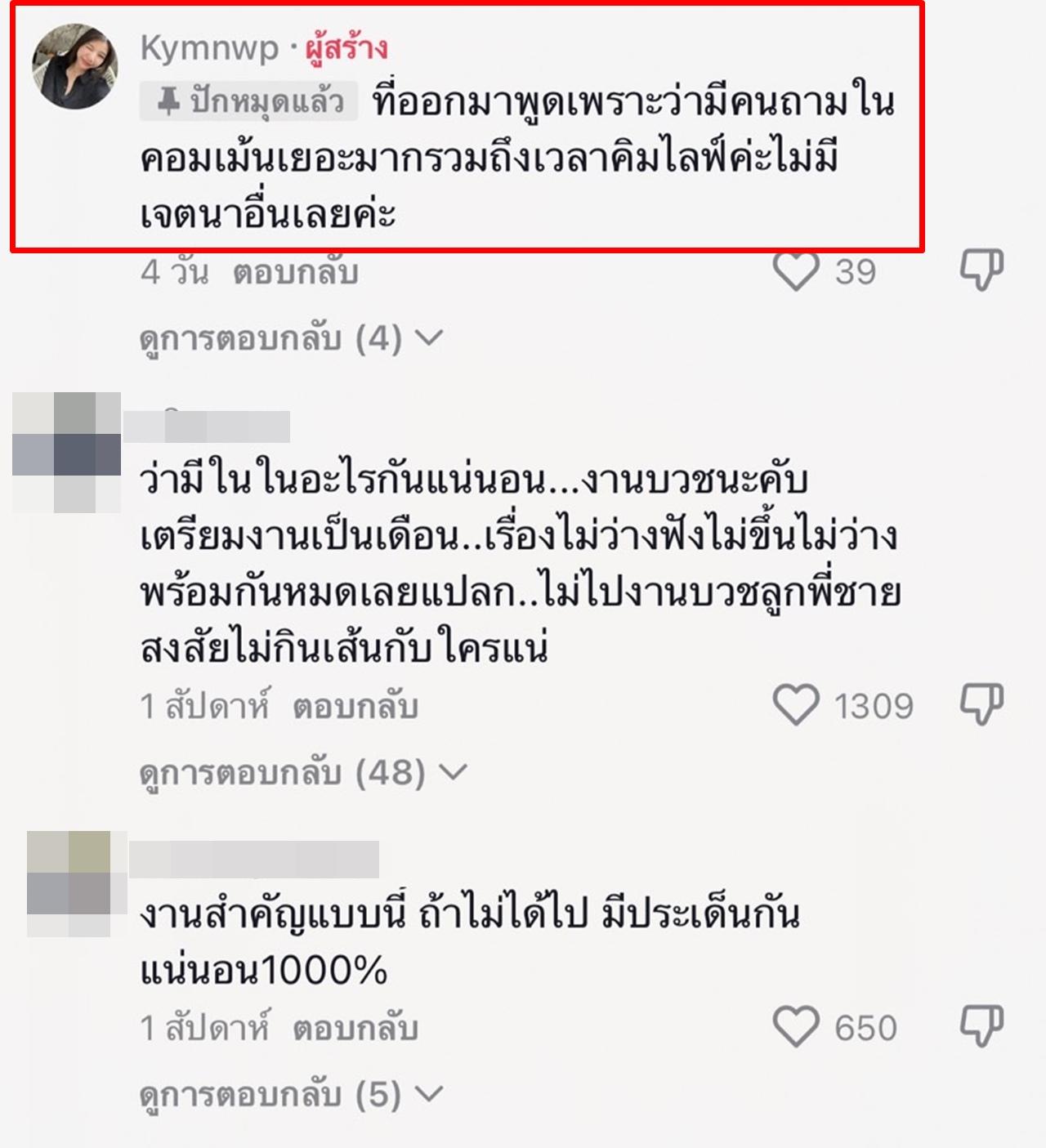 หลายคนที่ติดตามต่างก็ได้เข้ามาคอมเมนต์ในประเด็นนี้กันเป็นจำนวนมาก เช่น ว่ามีในอะไรกันแน่นอน...งานบวชนะคับเตรียมงานเป็นเดือน..เรื่องไม่ว่างฟังไม่ขึ้นไม่ว่างพร้อมกันหมดเลยแปลก..ไม่ไปงานบวชลูกพี่ชายสงสัยไม่กินเส้นกับใครแน่, งานสำคัญแบบนี้ ถ้าไม่ได้ไป มีประเด็นกันแน่นอน1000%, เอาจริงเวลามีงานที่บ้านแม่ของเท่งเช่นวันสงกรานต์วันเกิดแม่ของเท่งมีเท่งไปคนเดียวเมียกับลูกเท่งไม่เคยเห็นไป ญาติพี่น้องลูกหลานคนอื่นไปหมด, น่าจะเคืองๆกันตั้งแต่ตอนเท่มมีเรื่องกับเมียเรื่องที่เมียแฉเรื่องผู้หญิงรึเปล่าเดานะเพราะมีข่าวช่วงนั้นอยู่, งานบวชคือสำคัญในเครือญาตินะ