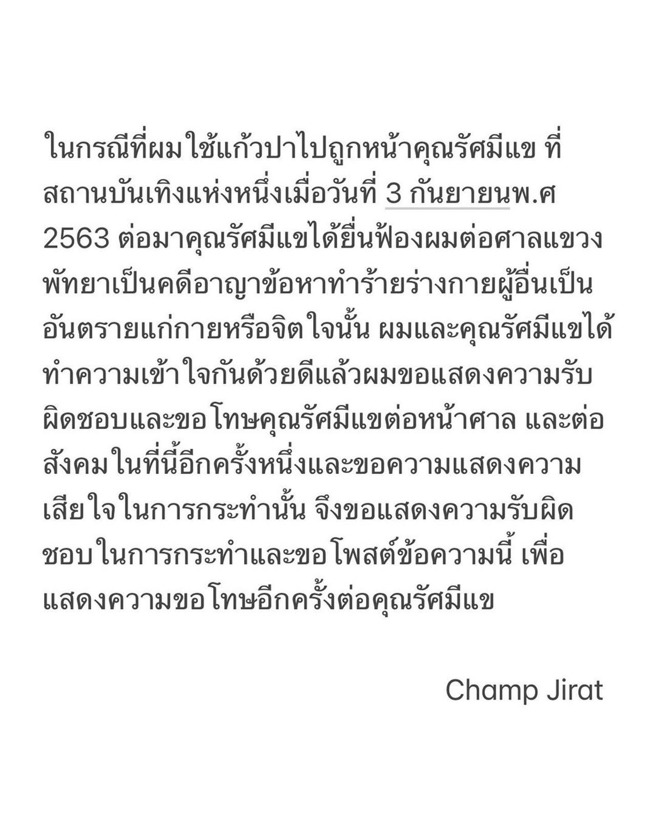 และขอความแสดงความเสียใจในการกระทำนั้น จึงขอแสดงความรับผิดชอบในการกระทำและขอ โพสต์ข้อความนี้ เพื่อแสดงความขอโทษอีกครั้งต่อคุณรัศมีแข Champ Jirat".