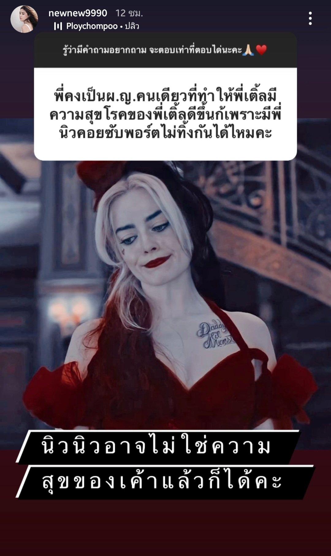 พี่คงเป็นผู้หญิงคนเดียวที่ทำให้พี่เติ้ลมีความสุข โรคของพี่เติ้ลดีขึ้นก็เพราะมีพี่นิวคอยซัพพอร์ต ไม่ทิ้งกันได้ไหมคะ?