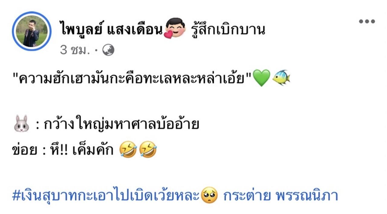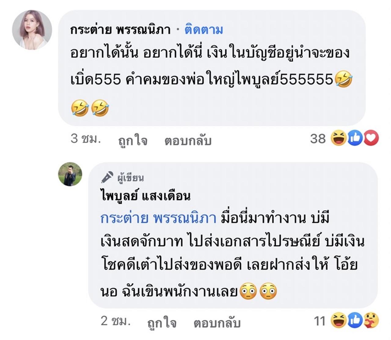ด้าน กระต่าย ก็ได้เข้ามาคอมเมนต์ถึงสามีว่า "อยากได้นั้น อยากได้นี่ เงินในบัญชีอยู่นำจะของเบิ่ด555 คำคมของพ่อใหญ่ไพบูลย์555555" และ ครูไพบูลย์ ตอบกลับว่า "มื่อนี่มาทำงาน บ่มีเงินสดจักบาท ไปส่งเอกสารไปรษณีย์ บ่มีเงิน โชคดีเต๋าไปส่งของพอดี เลยฝากส่งให้ โอ้ยนอ ฉันเขินพนักงานเลย".