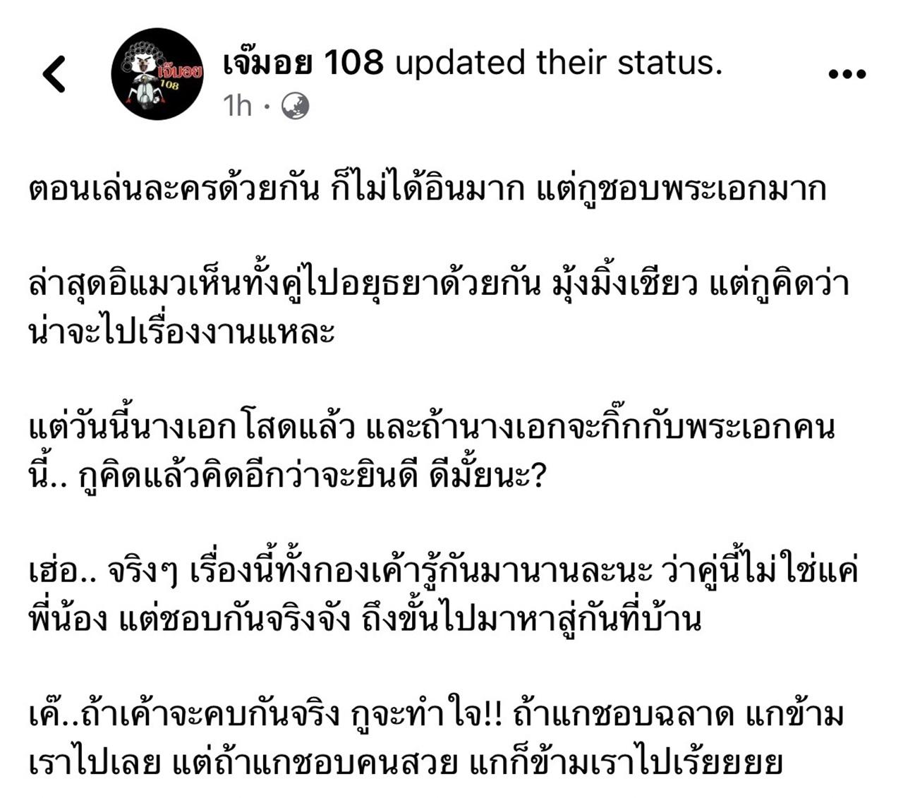 คือ เค้าบอกว่า “ตอนเล่นละครด้วยกัน ไม่ได้อินมาก แต่ชอบพระเอกมาก ล่าสุดอิแมวเห็นทั้งคู่ไปอยุธยาด้วยกัน มุ้งมิ้งเชียว แต่คิดว่าน่าจะไปเรื่องงานแหละ แต่วันนี้นางเอกโสดแล้ว และถ้านางจะกิ๊กพระเอกคนนี้ คิดแล้วคิดว่าจะยินดีดีมั้ยนะ?