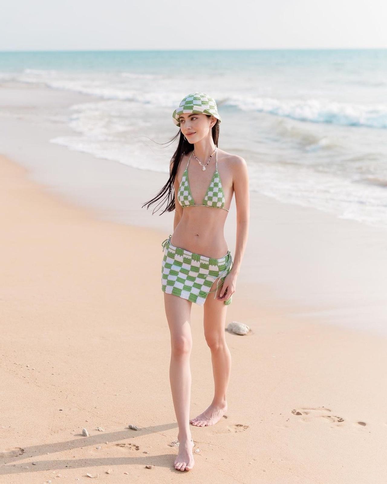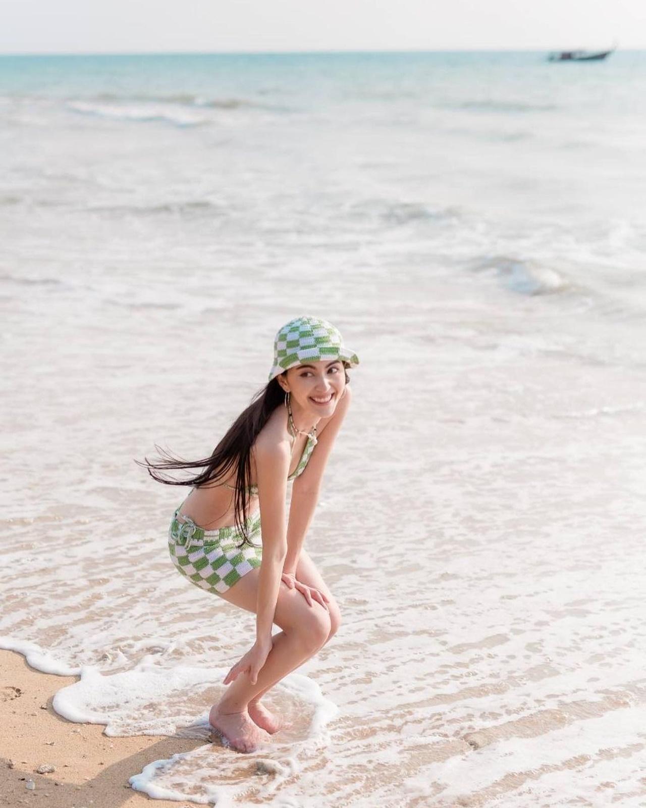 และภาพเซตบิกินีลายตารางสีเขียว ที่บอกเลยว่า แฟนๆ ได้เห็นหุ่นผอมเพรียว ผิวขาวโอโม่ และหน้าสวยๆ ของสาวใหม่จนหัวใจแทบละลาย