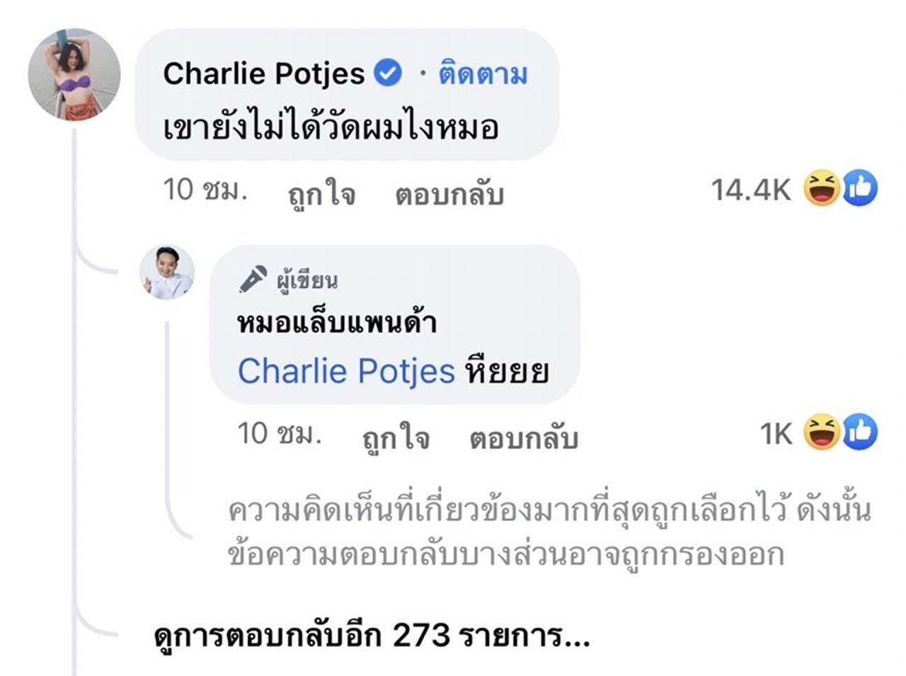 ก่อนหมอแล็บแพนด้าจะคอมเมนต์ตอบว่า "หืยยย" ซึ่งการคอมเมนต์ของหนุ่มแน็กนี้ก็ทำให้ลูกเพจถูกอกถูกใจเข้ามากดไลค์คอมเมนต์และแซวอย่างมากมาย.