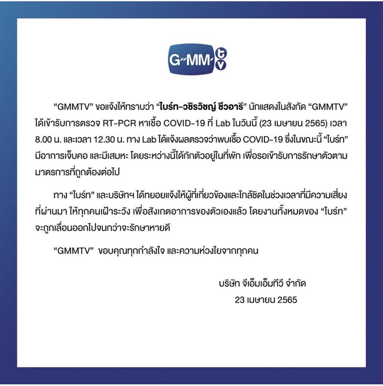 "GMMTV ขอแจ้งให้ทราบว่า ไบร์ท วชิรวิชญ์ ชีวอารี นักแสดงในสังกัด GMMTV ได้เข้ารับการตรวจ RT-PCR หาเชื้อ COVID-19 ที่ Lab ในวันนี้ (23 เมษายน 2565) เวลา 8.00 น. และเวลา 12.30 น. ทาง Lab ได้แจ้งผลตรวจว่าพบเชื้อ COVID-19