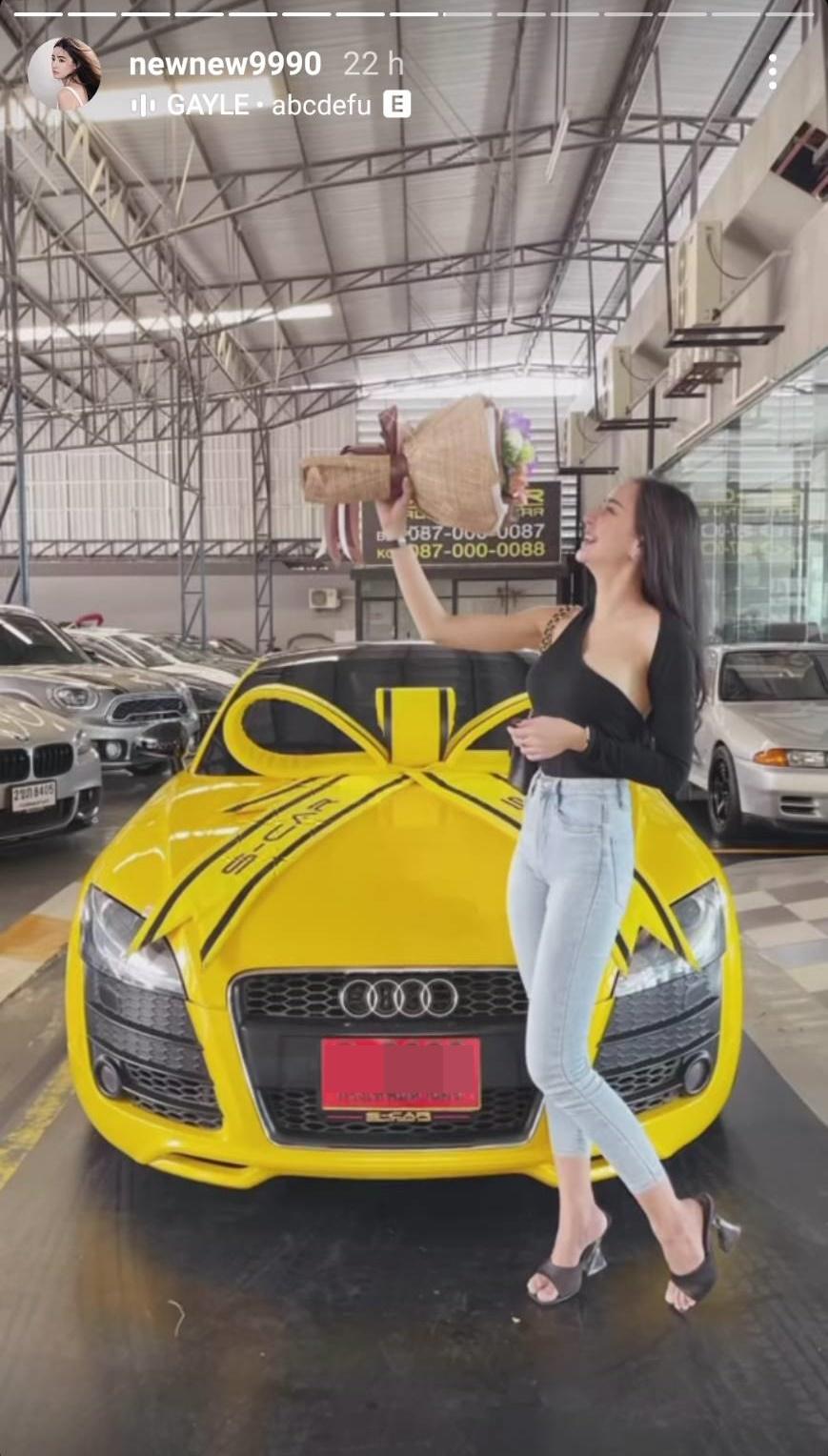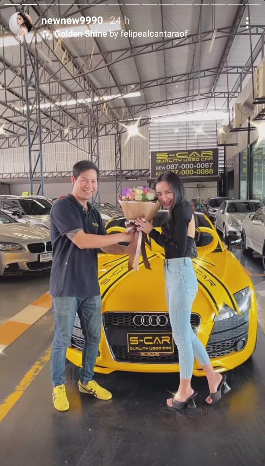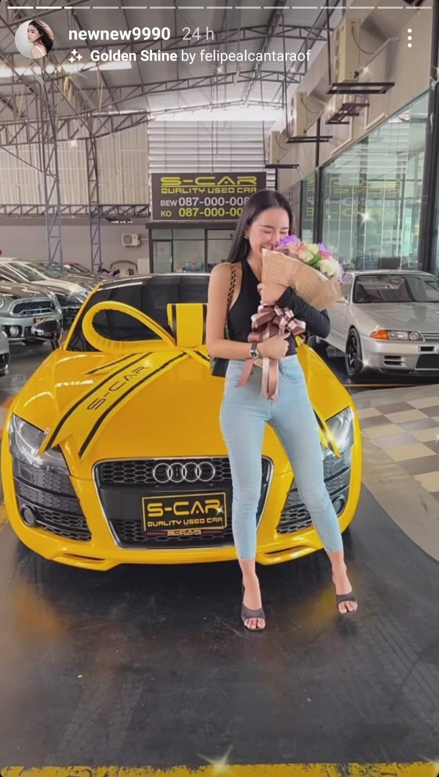 โดย นิวนิว เอวเด้ง โพสต์ภาพตัวเองคู่กับรถหรูสีเหลืองที่ซื้อเองด้วยเงินสด ในมือถือช่อดอกไม้ เขียนแคปชั่นสั้นๆ ว่า “Welcome Daisy #ก็ซื้อสิคะสดไปเลยสิคะ” โดยมีแฟนๆ เข้ามาคอมเมนต์แสดงความยินดี บ้างก็บอกว่าโสด สวย รวยด้วย ทำไรก็ได้ อีกทั้งยังชื่นชมในความสวยและเก่งของเจ้าตัว