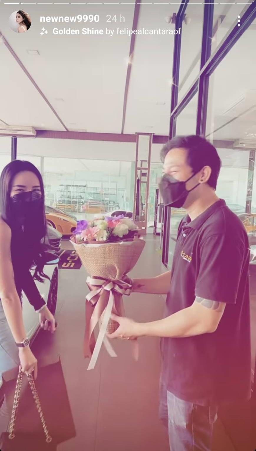 และเมื่อเข้าไปดูไอจีสตอรี่ นิวนิวก็ได้โพสต์ภาพและคลิปบรรยากาศตอนไปรับรถด้วยตัวเอง และมีชอตหนึ่งที่หนุ่มคนหนึ่งของโชว์รูมรถได้มอบดอกไม้กับนิวนิว ทำเอานิวนิวปลื้มที่ได้รับดอกไม้ บอกว่าผู้ชายซื้อดอกไม้ให้ แต่เพื่อนก็รีบดึงสติบอกว่าเขาไม่ได้ให้นิวนิว เขาให้กับ Daisy (รถ) นิวนิวบอกว่าปกติไม่เคยได้ดอกไม้จากผู้ชายเลย เพื่อนแซวว่าปกติเป็นยังไง นิวนิวบอกว่า “ซื้อให้ตัวเอง อันนี้เขาซื้อดอกไม้ให้นะคะ แต่รถซื้อเอง”