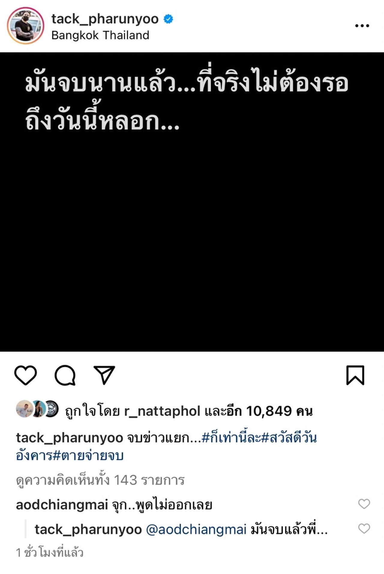 ล่าสุดด้าน แทค ภรัณยู ซึ่งเป็นอีกคนที่ติดตามข่าวเรื่องนี้มาตลอด ก็ได้โพสต์ภาพจอดำผ่านอินสตาแกรม พร้อมกับเขียนว่า "มันจบนานแล้ว…ที่จริงไม่ต้องรอถึงวันนี้หลอก" และเขียนแคปชั่นว่า "จบข่าวแยก... #ก็เท่านี้ละ #สวัสดีวันอังคาร #ตายจ่ายจบ" หลายคนที่ติดตามก็ได้เข้ามาแสดงความคิดเห็นในเรื่องนี้กันเป็นจำนวนมาก.
