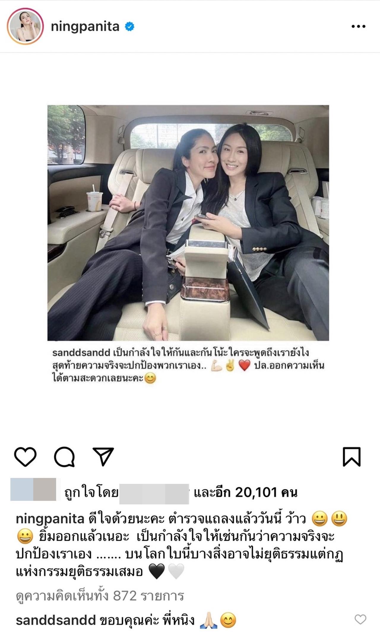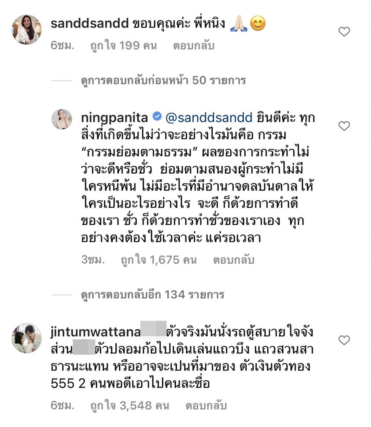 ซึ่ง หนิง ได้เขียนข้อความแสดงความยินดีกับ แซน และทิ้งท้ายไว้ว่า กฎแห่งกรรมยุติธรรมเสมอ "ดีใจด้วยนะคะ ตำรวจแถลงแล้ววันนี้ ว้าว ยิ้มออกแล้วเนอะ เป็นกำลังใจให้เช่นกันว่าความจริงจะปกป้องเราเอง....บนโลกใบนี้บางสิ่งอาจไม่ยุติธรรมแต่กฎแห่งกรรมยุติธรรมเสมอ" และ แซน ก็ได้เข้ามาขอบคุณ