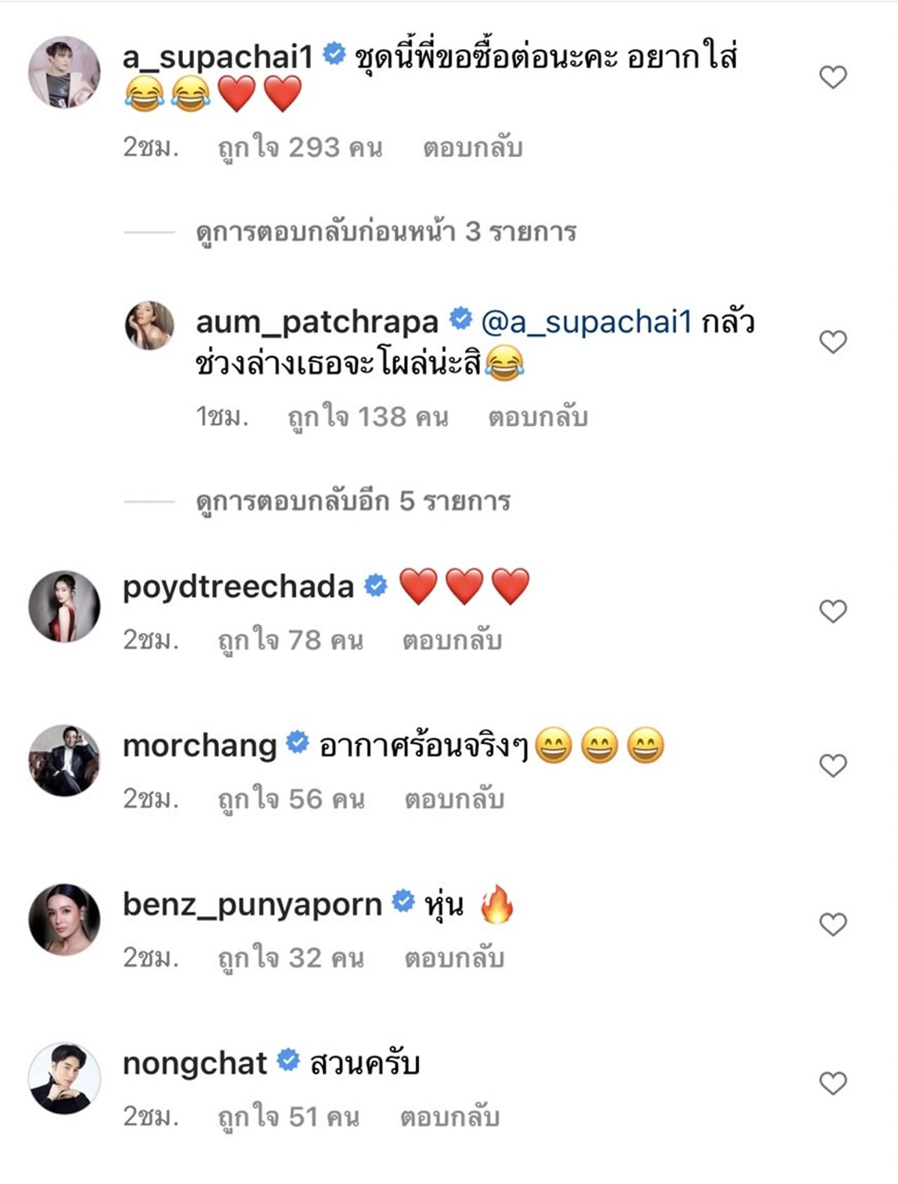"ชุดนี้พี่ขอซื้อต่อนะคะ อยากใส่" งานนี้สาวอั้มก็ได้เข้ามาคอมเมนต์ตอบพี่คนสนิททันทีว่า "กลัวช่วงล่างเธอจะโผล่น่ะสิ" ซึ่งการคอมเมนต์แซวกันของอั้มและพี่เอนั้นทำเอาแฟนๆ ถูกใจไม่น้อย เข้ามากดไลค์อย่างมากมายล้นหลาม.