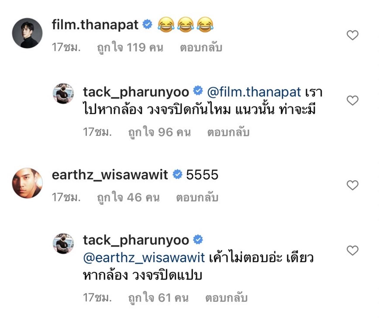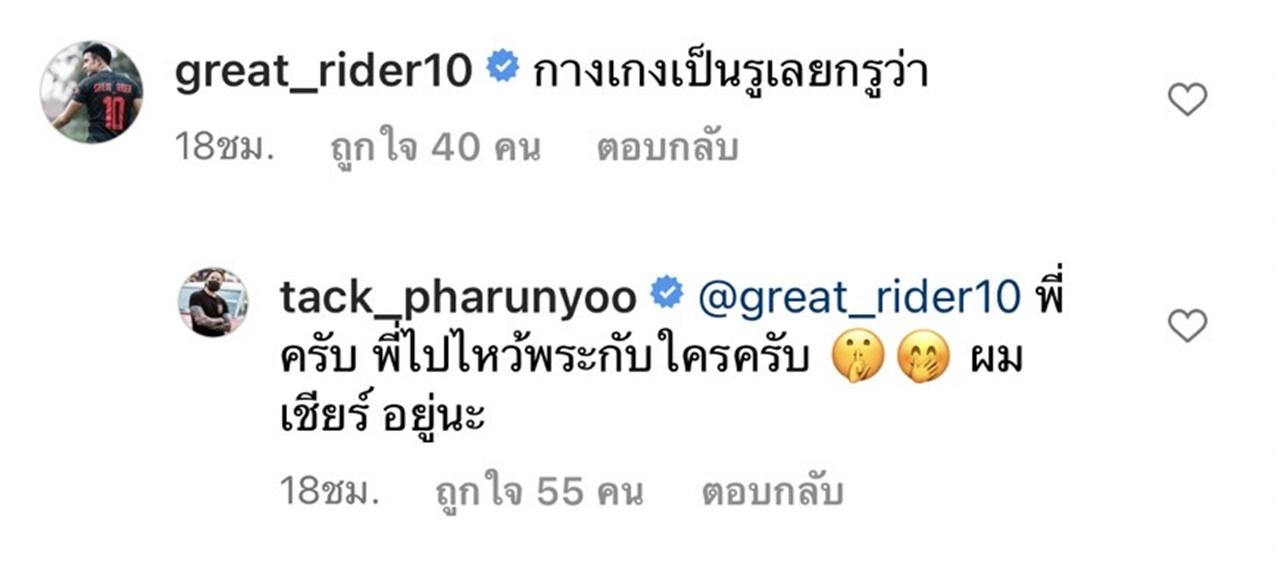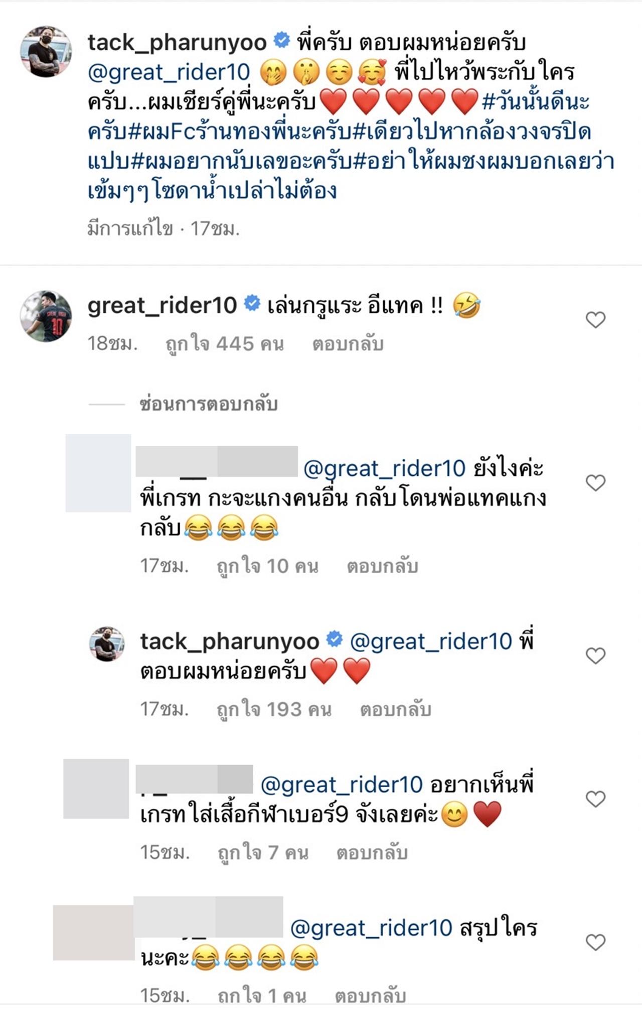 ทำเอาแฟนๆ ถึงกับรอฟังคำตอบกันอย่างใจจดจ่อ เมื่อคุณพ่อลูกหนึ่ง แทค ภรัณยู ได้แคปคอมเมนต์ที่เข้าไปถามพระเอกหนุ่ม เกรท วรินทร ว่า "พี่ครับ พี่ไปไหว้พระกับใครครับ ผมเชียร์ อยู่นะ"