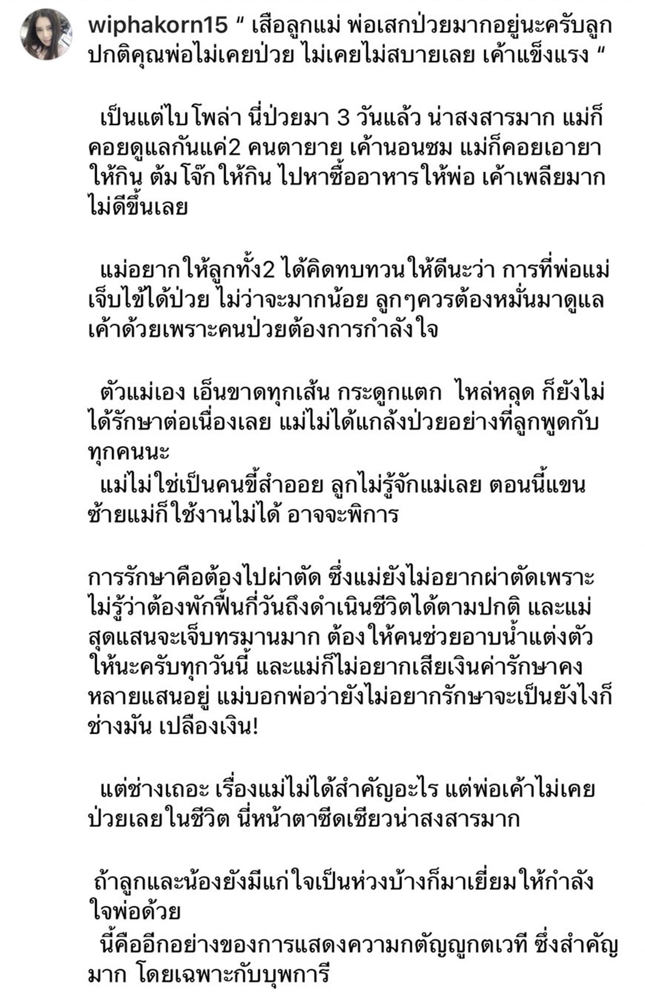 แต่วันนี้แม่ได้มาบอกลูกแล้ว เพราะแม่สงสารพ่อ ถึงลูกจะโทรมาถามเค้าเค้าก็ไม่พูดหรอกว่าอาการเค้าแย่ เพราะเค้าเป็นคนแบบนั้นแหละ ไม่ต้องการให้ใครกังวลแต่ลูกๆ ทุกคนควรจะแสดงความกตัญญูกตเวที ถ้าไม่ทำตอนนี้แล้วจะทำตอนไหน!! ฝากไปให้คิดดูดีๆ!! เสือกวาง ! #นี่คือพ่อแม่".