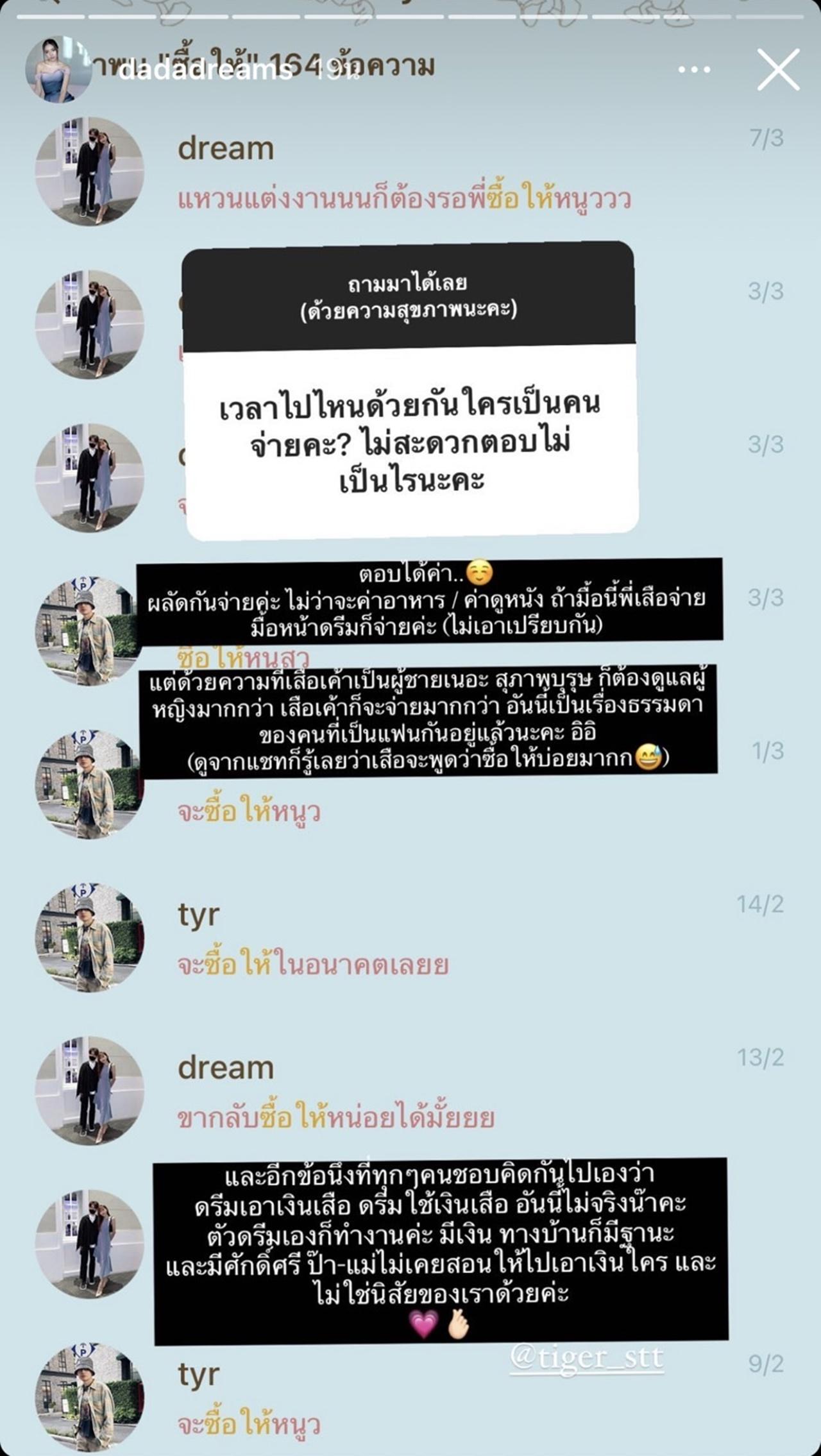 "ตอบได้ค่า ผลัดกันจ่ายค่ะ ไม่ว่าจะค่าอาหาร/ค่าดูหนัง ถ้ามื้อนี้พี่เสือจ่าย มื้อหน้าดรีมก็จ่ายค่ะ (ไม่เอาเปรียบกัน) แต่ด้วยความที่เสือเค้าเป็นผู้ชายเนอะ สุภาพบุรุษก็ต้องดูแลผู้หญิงมากกว่า