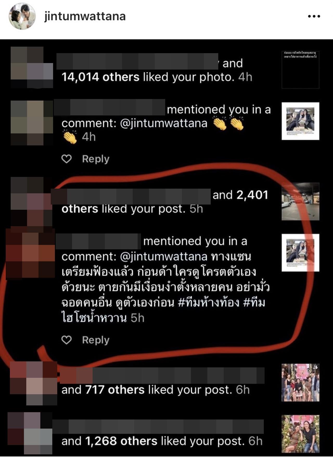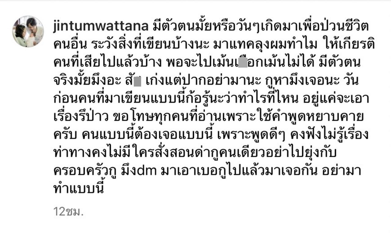 งานนี้ จิน ก็ได้โต้ตอบอย่างดุเดือดว่า "มีตัวตนมั้ยหรือวันๆ เกิดมาเพื่อป่วนชีวิตคนอื่น ระวังสิ่งที่เขียนบ้างนะ มาแทคลุงผมทำไม ให้เกียรติคนที่เสียไปแล้วบ้าง พอจะไปเม้นเ_ือกเม้นไม่ได้ มีตัวตนจริงมั้ยมึงอะ สั_ เก่งแต่ปากอย่ามานะ กูหามึงเจอนะ วันก่อนคนที่มาเขียนแบบนี้ก้อรู้นะว่าทำไรที่ไหน อยู่แค่จะเอาเรื่องรึป่าว